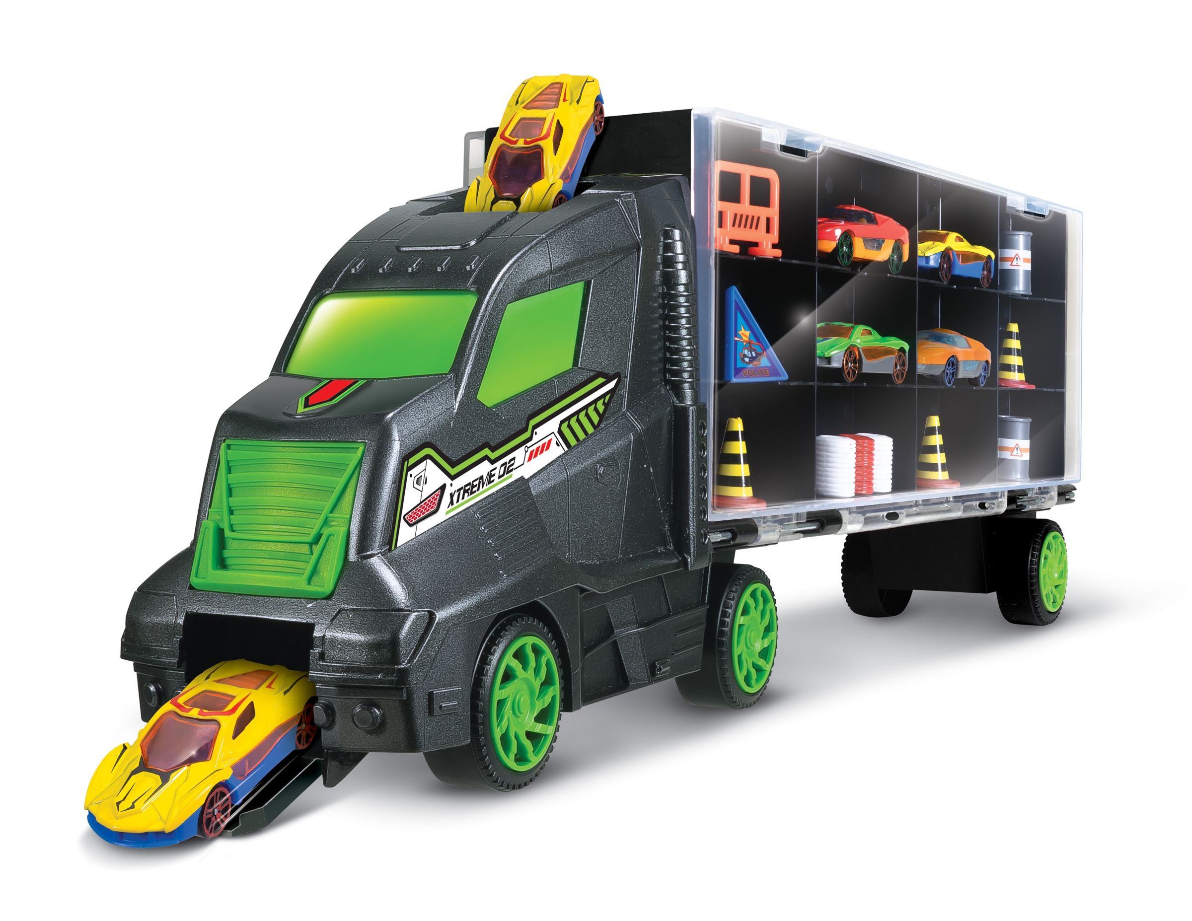 Auto kamión s auty. Velikost kamiónu 48 cm, aut 7 cm. Kabina kamiónu průjezdná auty. Součástí kamión s volnými koly, úložnou plochou a držadlem, 4 auta s volnými koly, barely, kužely, zábrana.