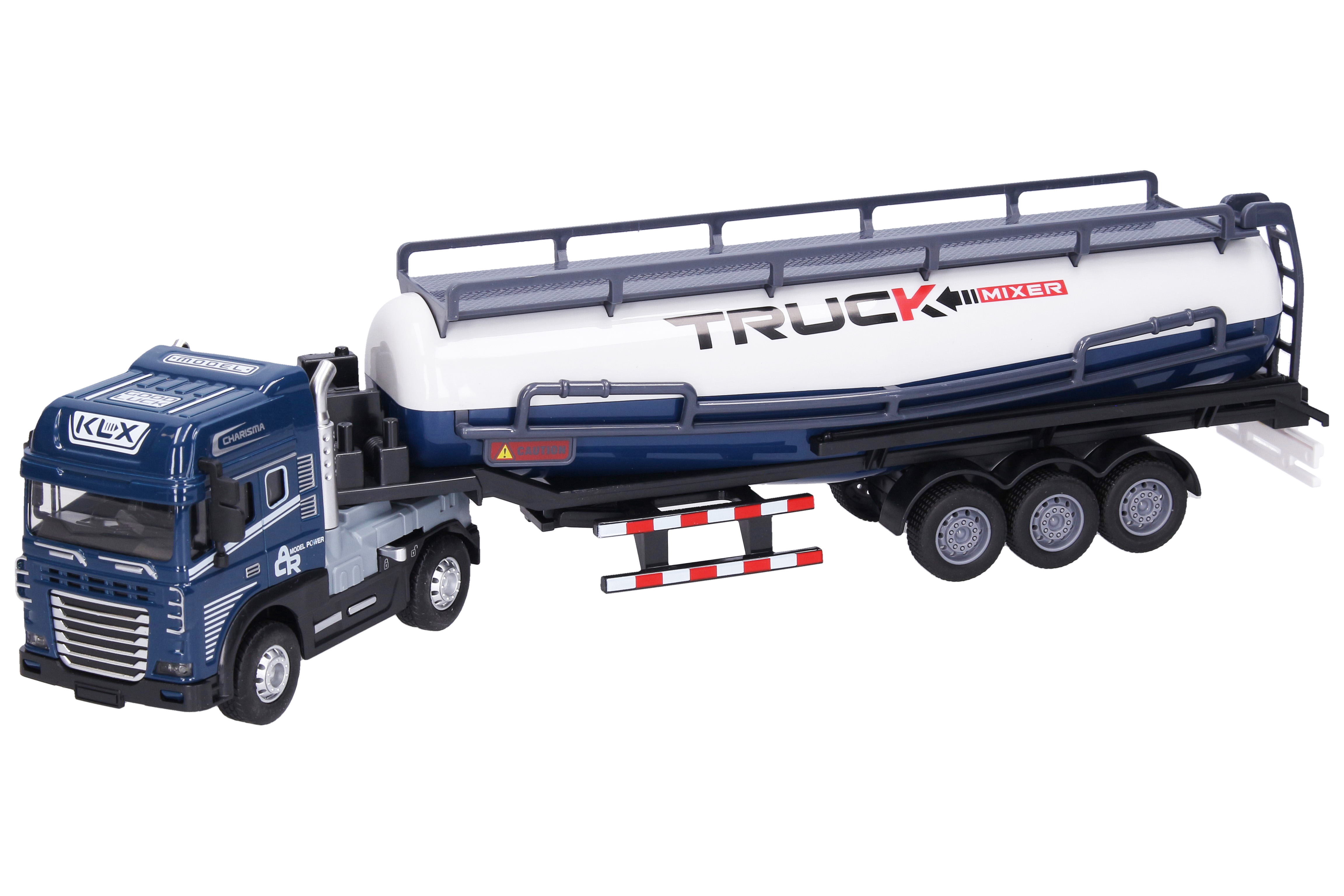 Auto kovové tahač cisterna na setrvačník s efekty. Délka 40 cm. Na setrvačník. Vydává světelné a zvukové efekty. Aktivace pohybem předních kol. Páčka na uzamčení návěsu. Návěs je možné odpojit. Baterie 3xAG13, součástí balení.