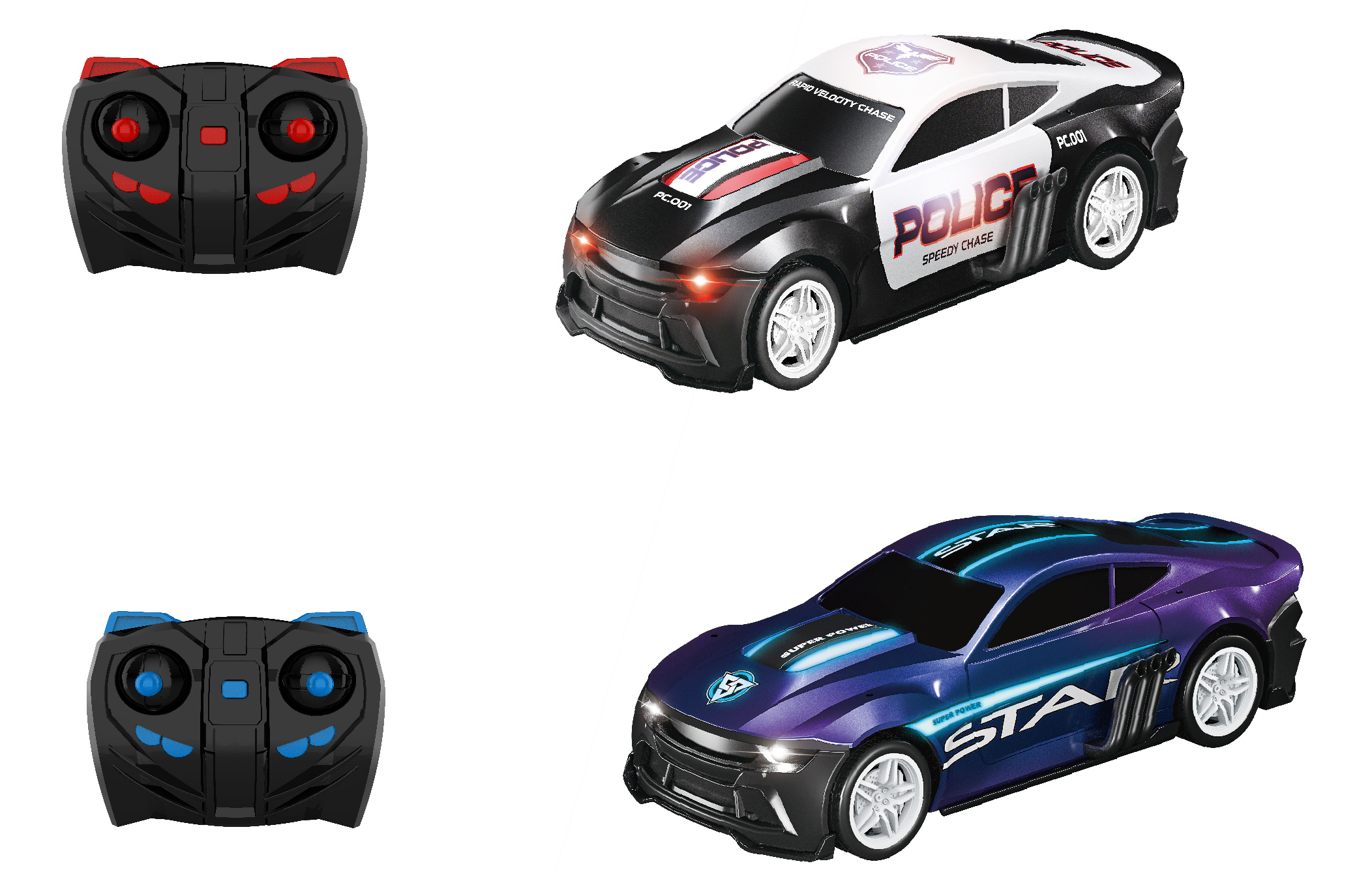 Bitva aut RC na dálkové ovládání. Součástí 2 auta. Velikost 25 cm. Frekvence 2.4GHz. Světelné efekty. Bateriový pack 3.7V do každého auta součástí, 2xAA do každého ovladače nejsou součástí. USB kabel součástí. ON/OFF tlačítko na ovladači. Nárazem do výfuku na levé straně auta dojde k jeho vykolejení.