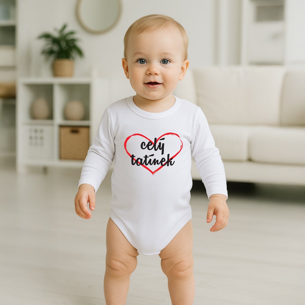 Originální bavlněné kojenecké body s dlouhým rukávem New Baby, s vtipným nápisem celý tatínek. Barvy použité k potisku jsou certifikované a vhodné pro miminka. Je vyrobeno z příjemného a kvalitního materiálu, ve kterém se bude Vaše miminko cítit příjemně. Body má zapínáni na cvočky na ramínku a mezi nožičkami, což usnadňuje oblékání a přebalování. Dopřejte Vašemu miminku vyniknout v originálním body. Složení: 100% bavlna. Rozměry: obvod kolem hrudníku cca 34 cm, délka rukávu cca 16 cm, celková délka cca 30 cm.