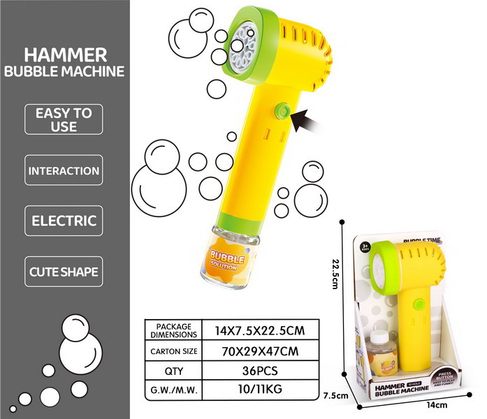 Bublifuk kladivo. Objem 90 ml, náplň součástí balení. 4xAA baterie nejsou součástí balení.