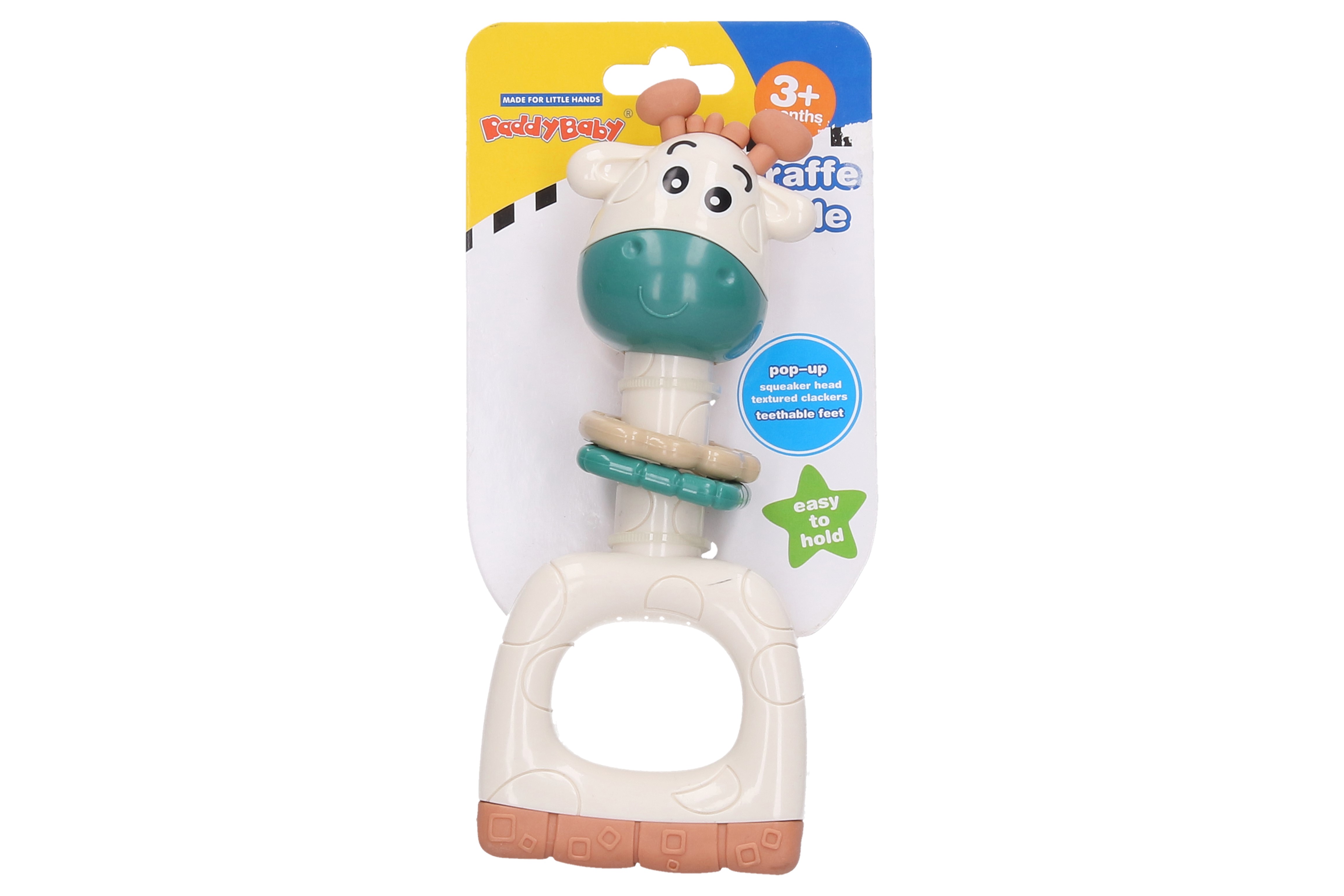 Chrastítko pískací žirafa. Velikost 16 cm. Zmáčknutím hlavy směrem dolů píská.