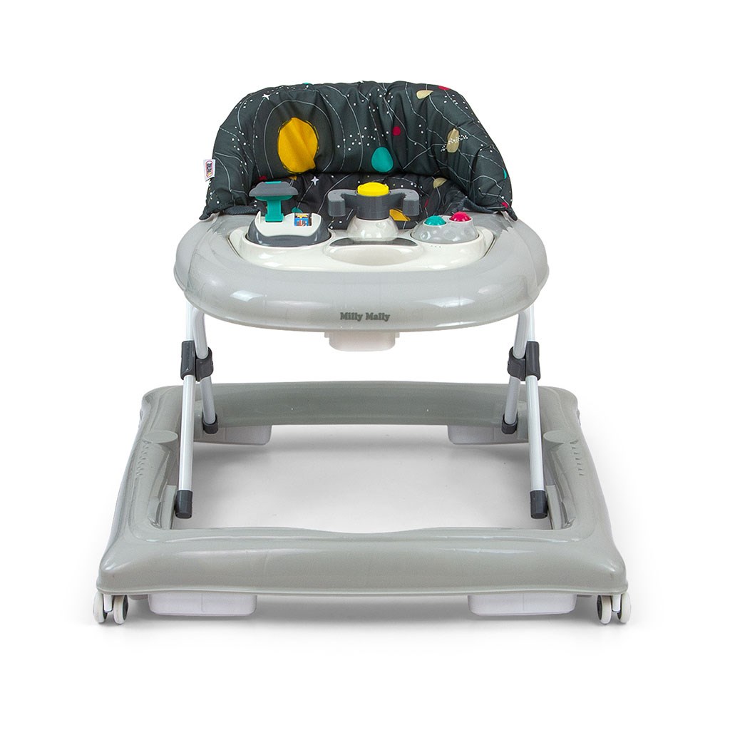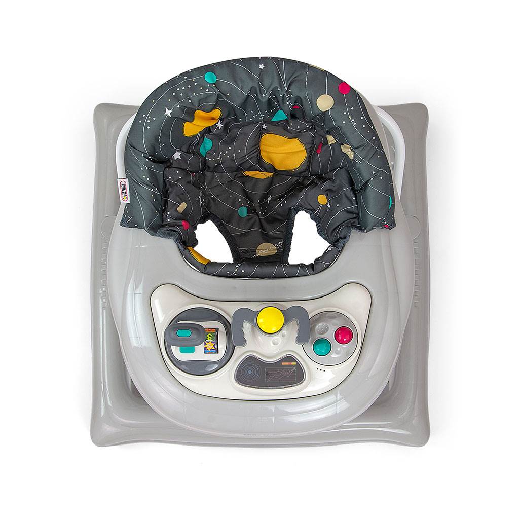 Výrobek má výukový panel, který obsahuje řadu překvapení čekajících na malé průzkumníky: světýlka, pískání, melodie, chrastítko, tlačítka a další pohyblivé prvky. Po sejmutí panelu z podnosu chodítka poslouží jako samostatná hračka, například jako společník na cesty, a deska poslouží jako hrací stolek.
