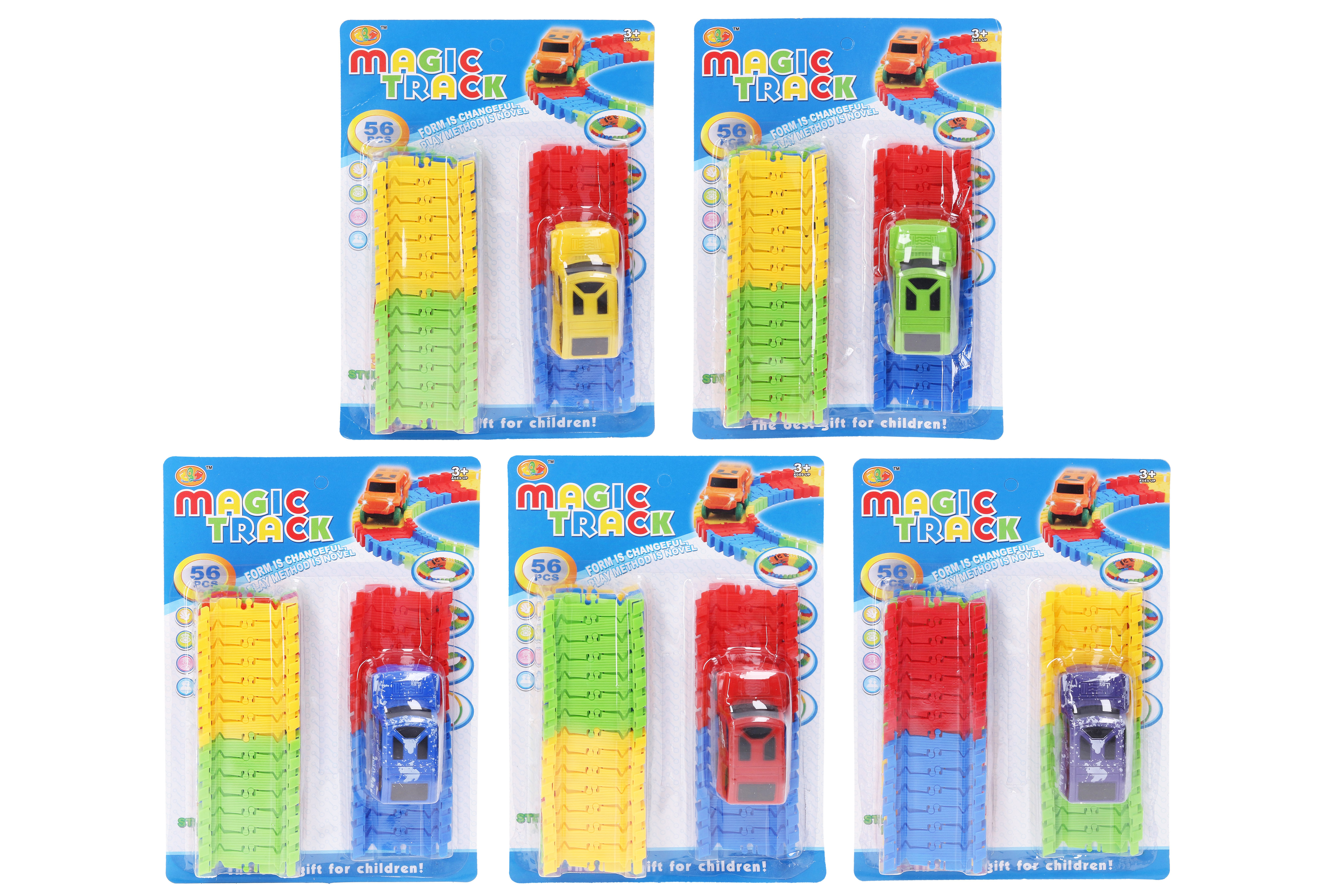 Dráha s autem. Velikost auta 8 cm. 1xAA baterie do auta není součástí. Žádné světelné a zvukové efekty. 4 varianty auta - zelené, žluté, modré, fialové.