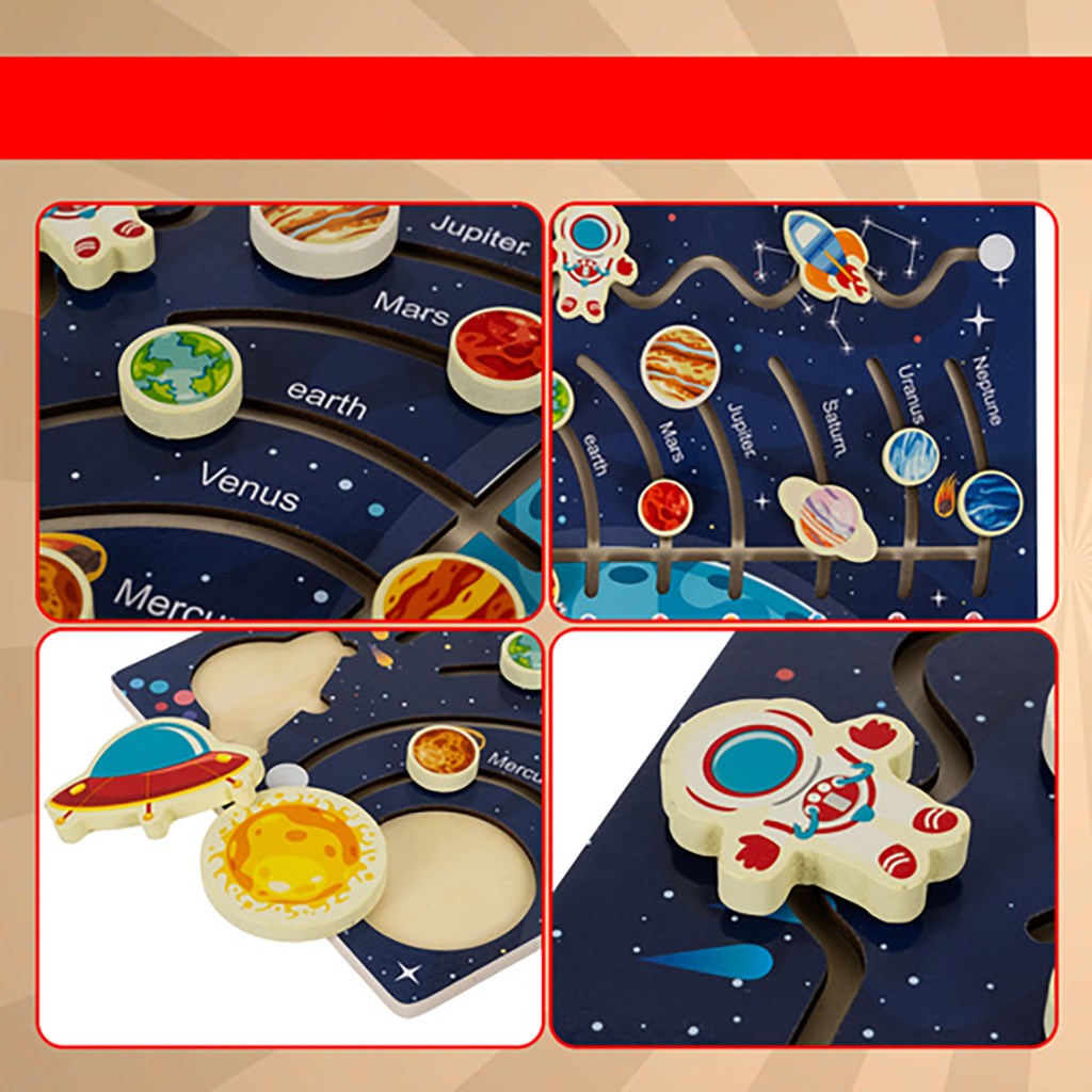 Dřevěné Montessori puzzle – Sluneční soustava: labyrint s planetami a raketou – motorická a logická vzdělávací hra pro děti