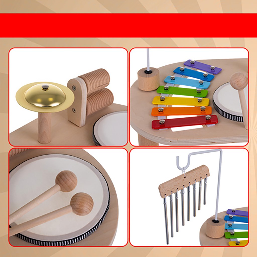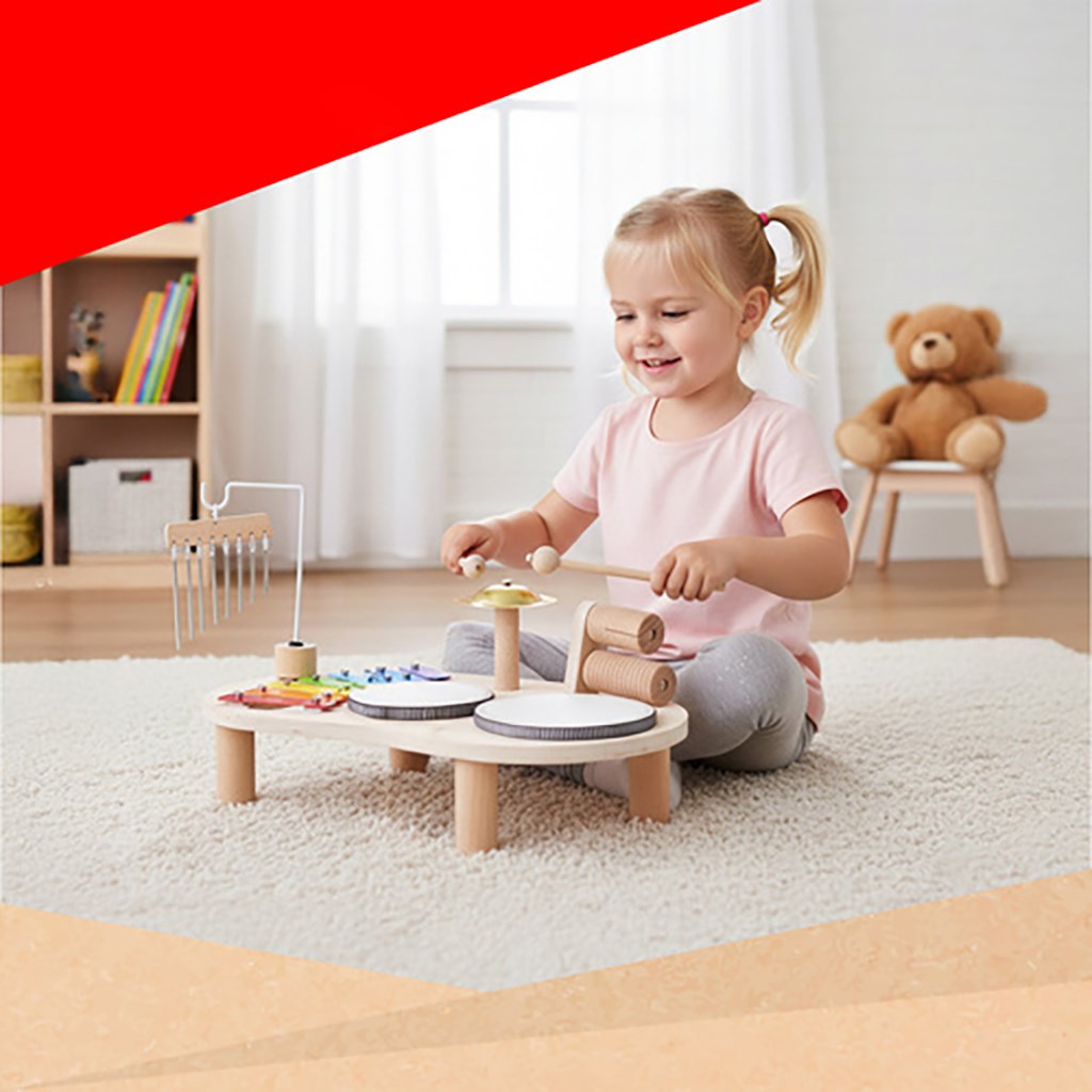 Dřevěný vzdělávací stolek „Perkuse” – senzorický Montessori s?cymbálky, bubny a chrastítky pro děti – hudební a senzorický rozvoj pro malé děti