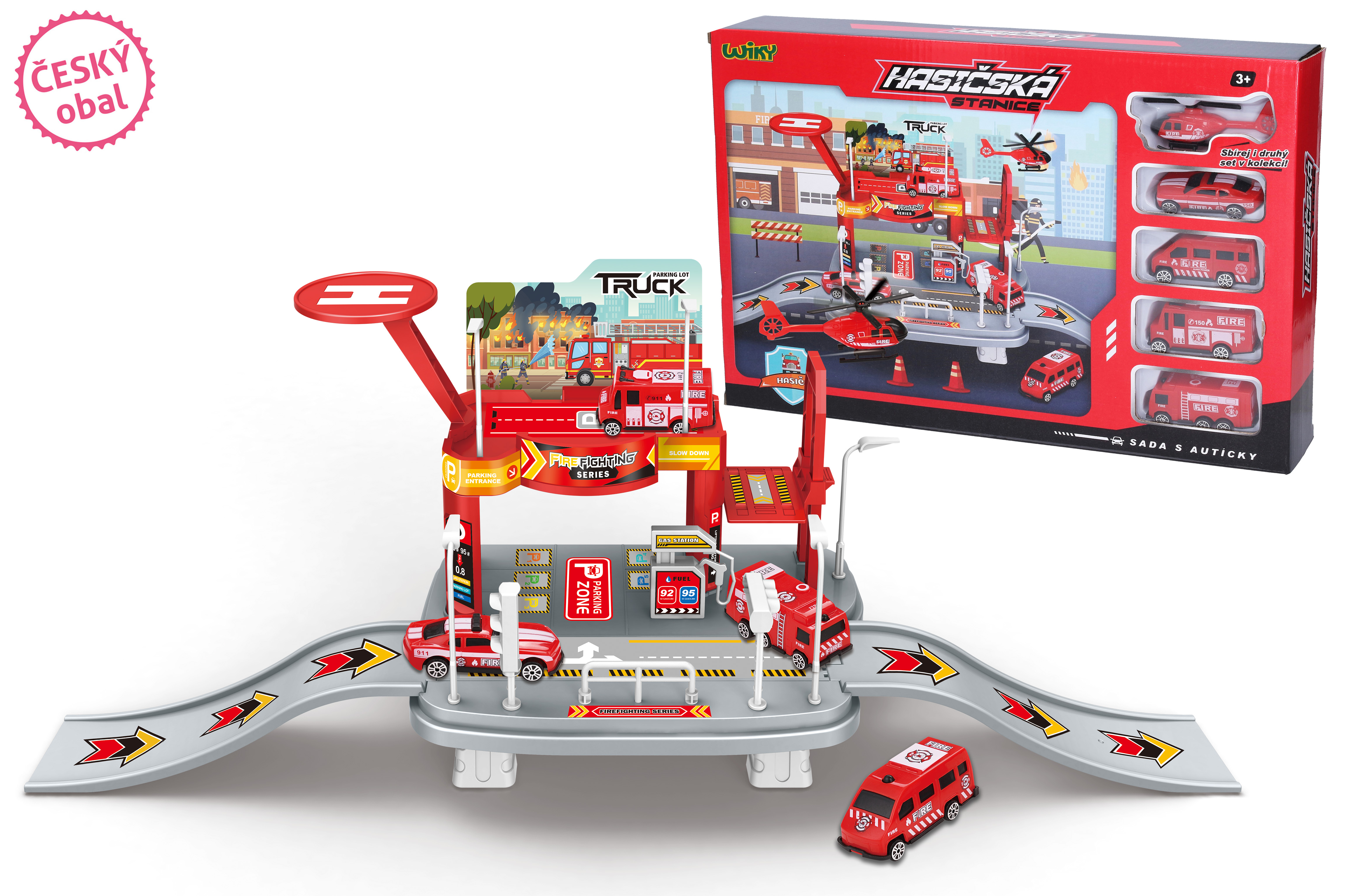 Hasičská stanice s auty. Rozměry 65x19x24,5 cm. Součástí 4 auta 7 cm, 1 vrtulník 9 cm, manuální výtah, heliport, čerpací stanice, značky. Obrázkový návod na složení na boční straně obalu.