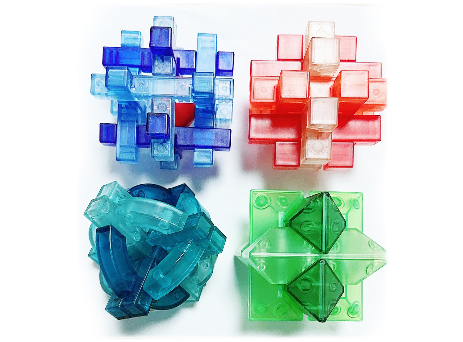 Hlavolam. Velikost 7 cm. Obsahuje obrázkový návod na složení. 4 varianty.