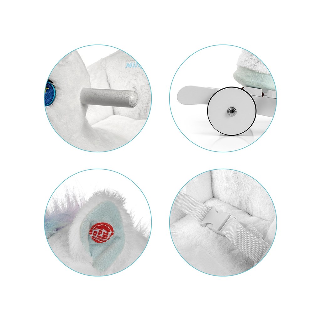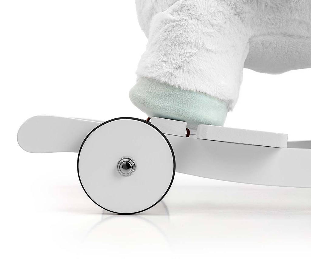 Koník má dřevěné lyžiny s opěrkami na nohy a madla, která pomáhají udržet rovnováhu při hraní, a také sadu skládacích koleček, díky kterým se během pár vteřin promění v úžasné plyšové vozítko.
