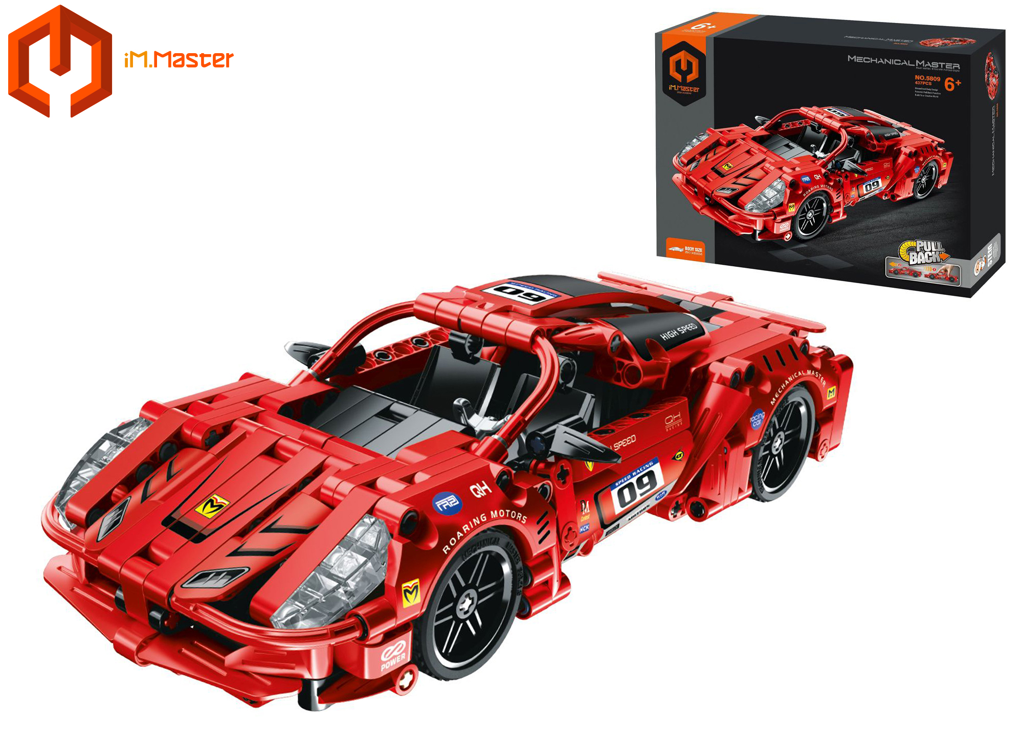 iM.Master Stavebnice závodní auto červené. Rozměry 25x11,4x6,6 cm. 437 dílků. Na zpětné natažení. Otevírací dveře.