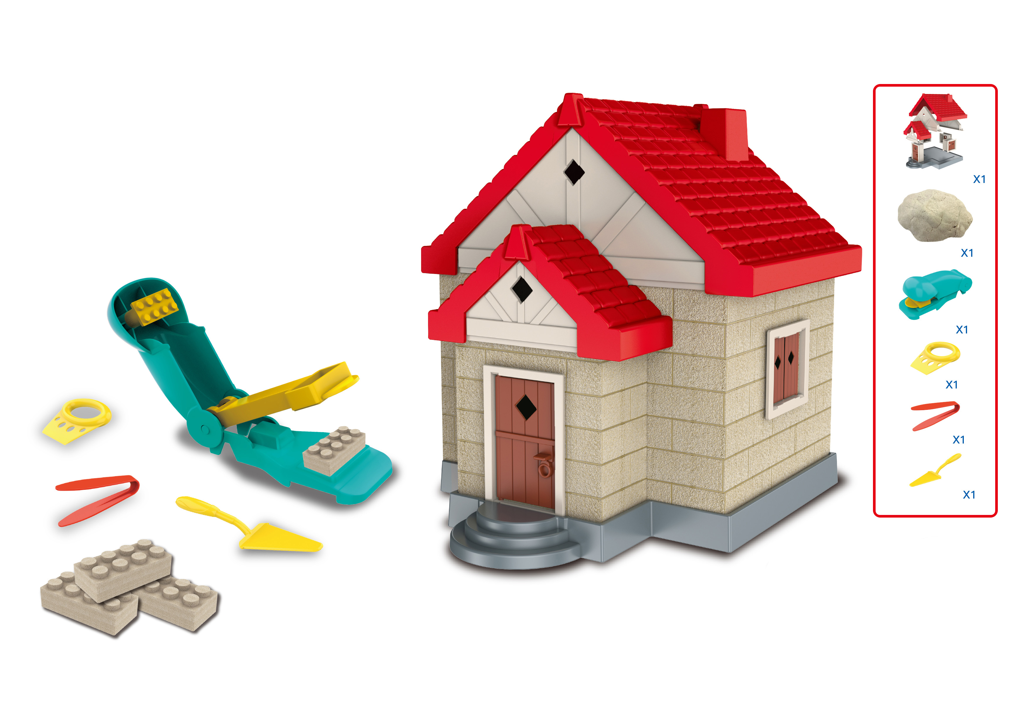Kinetický písek sada na stavbu s cihliček Dům. Obsah balení 750g. Obsahuje formu na tvorbu cihliček. Balení také obsahuje díly na stavbu domečku a další nástroje na práci s pískem. Obrázkový návod na zadní straně obalu. Po vytažení z formičky nechejte písek 1 minutu schnout. Pokud potřebujete menší cihličku, rozkrojte větší na půl, pomocí přiloženého nástroje.