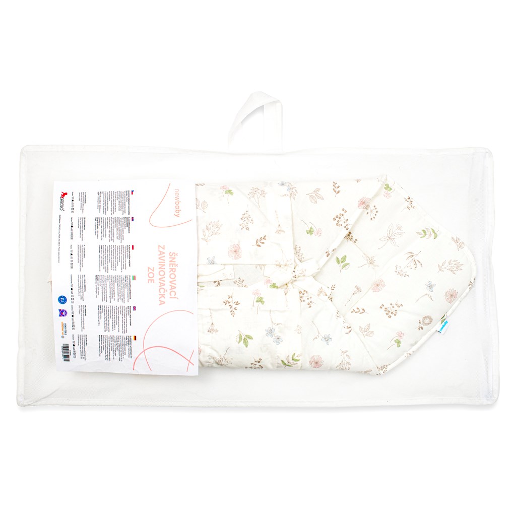 Nádherná měkoučká klasická šněrovací zavinovačka české značky New Baby Zoe. Zdobená obrázky květin. Klasické zavinovačky se vracejí zpět. Klasická zavinovačka poskytne Vašemu miminku pocit bezpečí. V zavinovačce je mnohem klidnější, protože se cítí bezpečně jako v maminčině bříšku. Zavinovačku můžeme použít pro ukládání kojenců ke spánku, ke kojení i do kočárku. Zavinovačka se zavazuje na tři řady stuh, které Vaše miminko pevně zavinou.