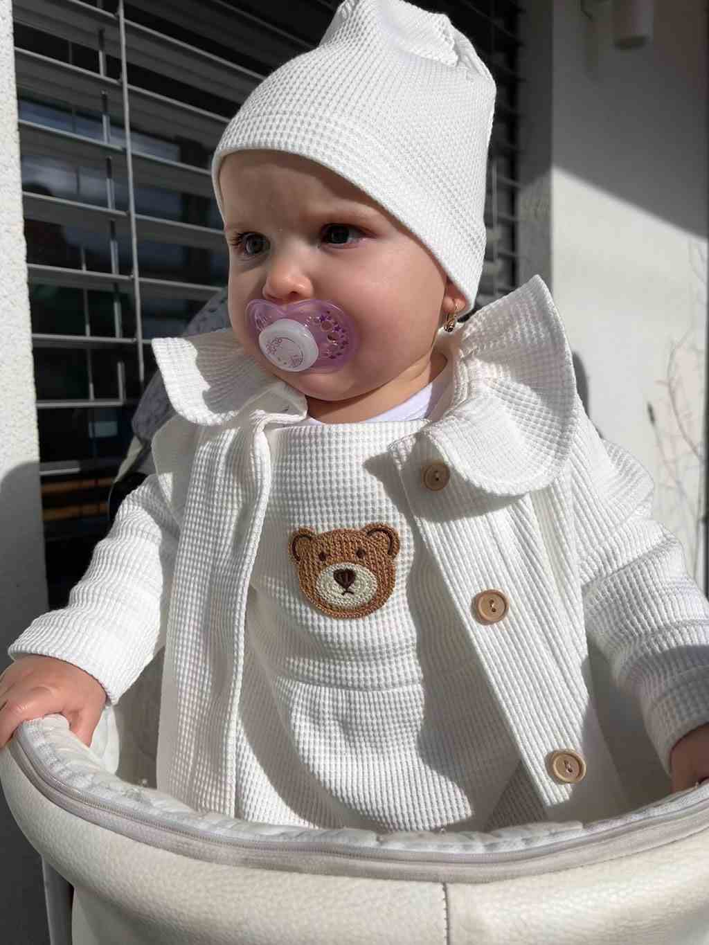 Krásná a stylová čepička české značky New Baby Luxury clothing. Je vyrobena z příjemného materiálu, ve kterém se vaše miminko bude cítit velmi pohodlně. Čepička netlačí a bude dobře držet na hlavičce miminka. Složení 100% bavlna.