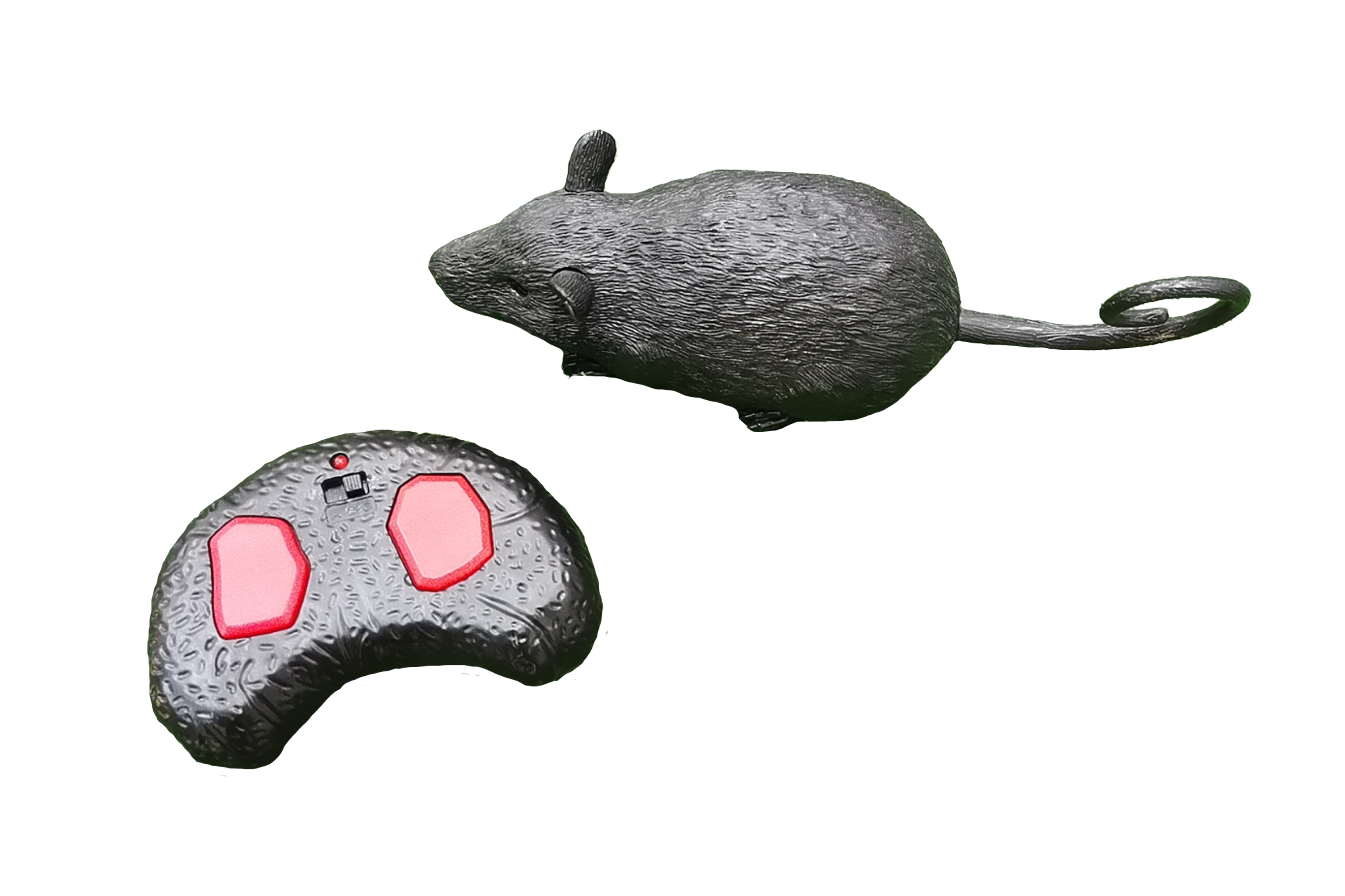Krysa RC na dálkové ovládání. Velikost 22 cm. Infračervený port, kanál A,B,C. Světelné efekty. 2xAAA baterie do krysy, 3xAAA do ovladače nejsou součástí. Přepínač ON/OFF na spodní straně krysy. Levé tlačítko - pohyb dopředu, pravé tlačítko - otáčení. Podržením obou tlačítek po dobu 7 vteřin - demo funkce, přerušení levým tlačítkem. Manuální otevírací tlama.