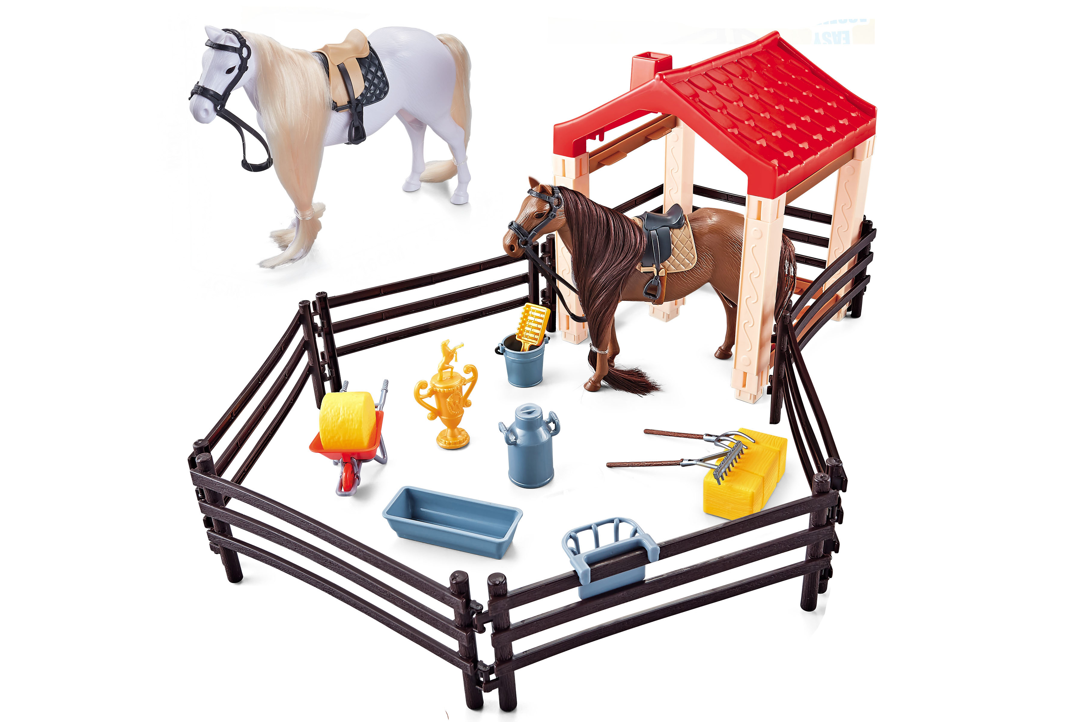 Kůň 2 ks s ohradou. Velikost koně 14cm. Obsahuje 2 koně, ohradu a přístřešek pro koně, příslušenství k péči o koně. Návod ke složení ohrady a přístřešku na obale.