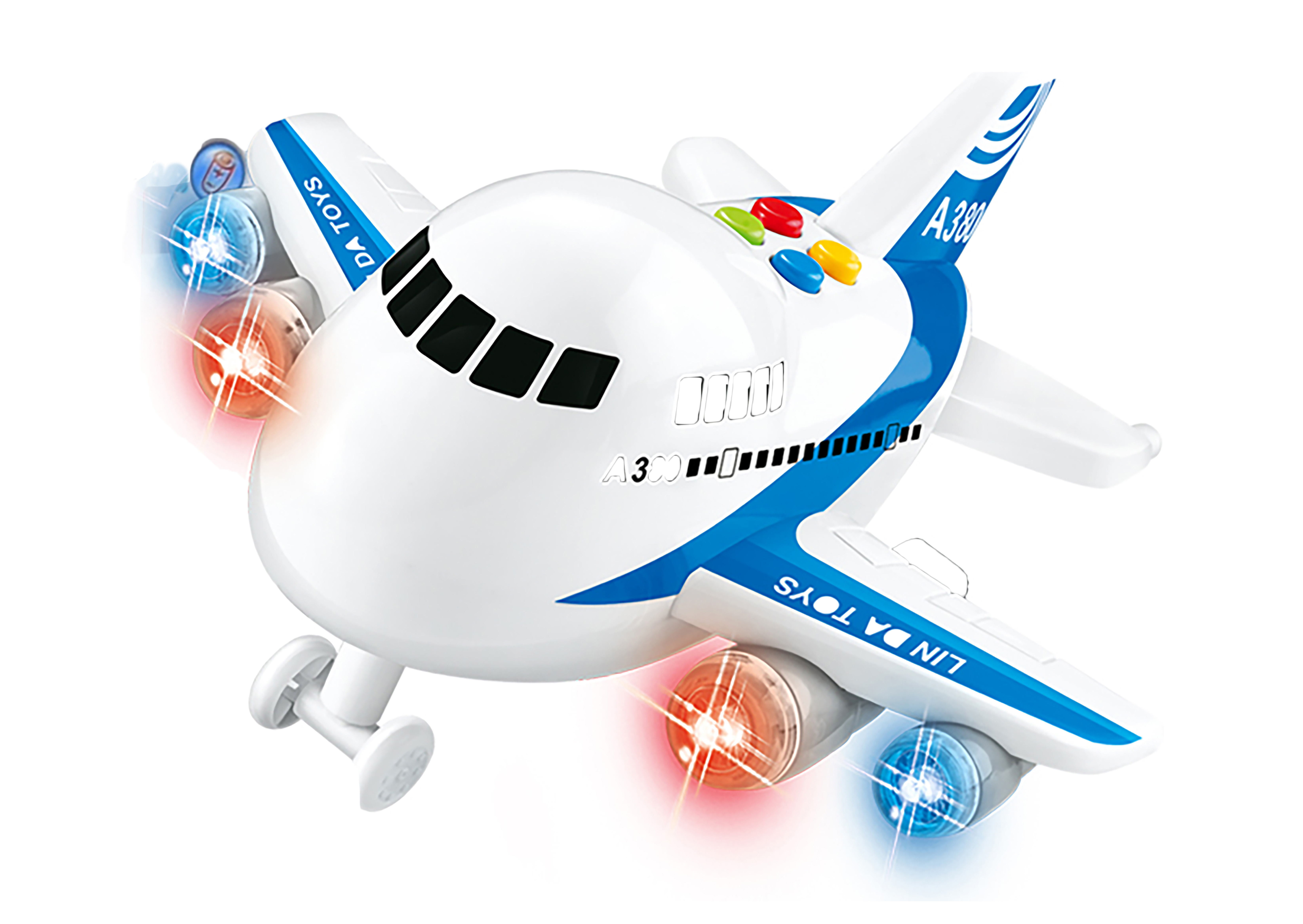 Letadlo na setrvačník s efekty. Rozměry 21x22x13,5 cm. Na setrvačník. Vydává světelné a zvukové efekty. Aktivace tlačítky na střeše. 2xAA baterie nejsou součástí.