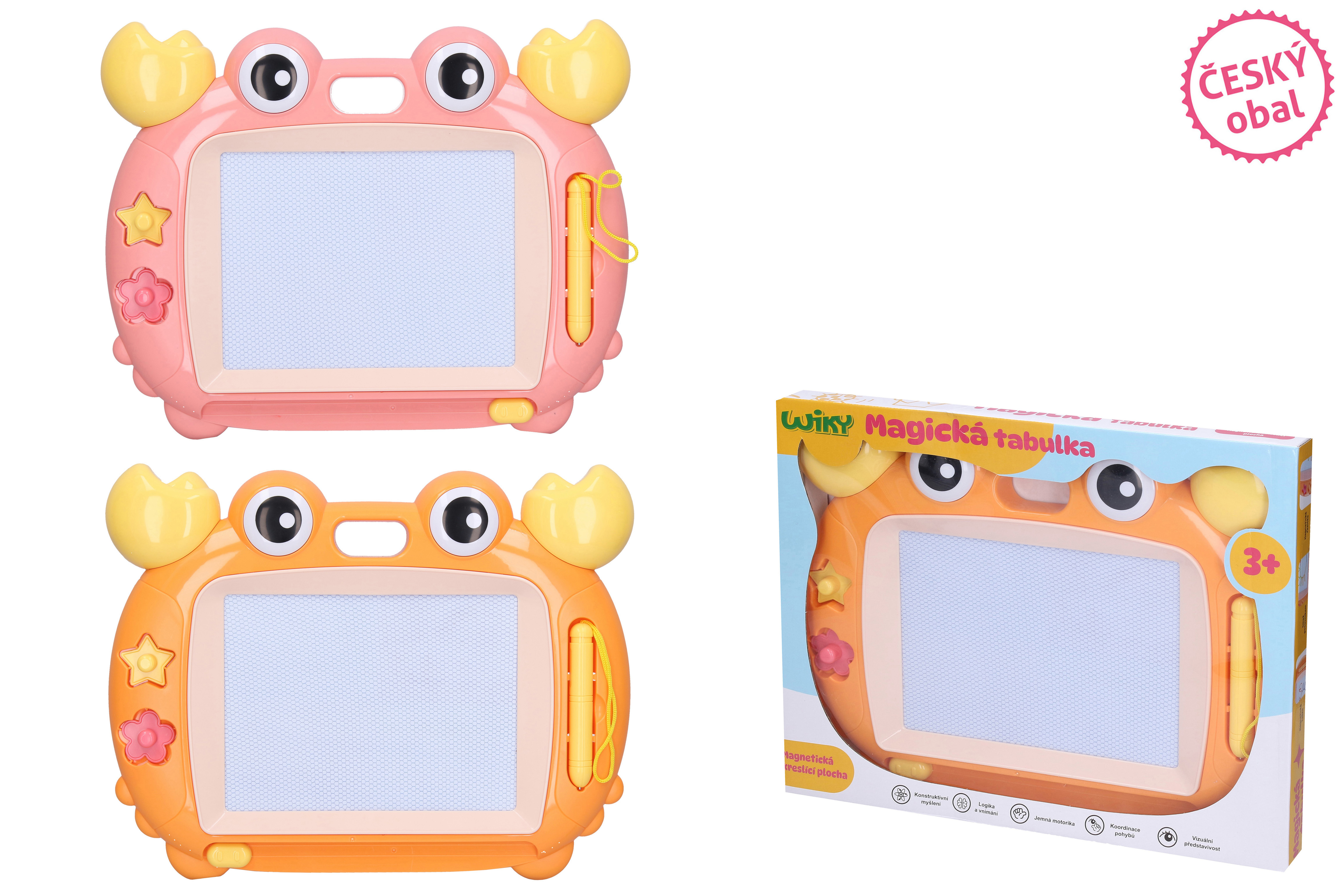 Magická kreslící tabulka. Velikost 33 cm. 2 varianty- růžová, oranžová. Obsahuje tužku na kreslení na tabulku, magnetky na razítkování. Posuvníkem se tabulka maže.