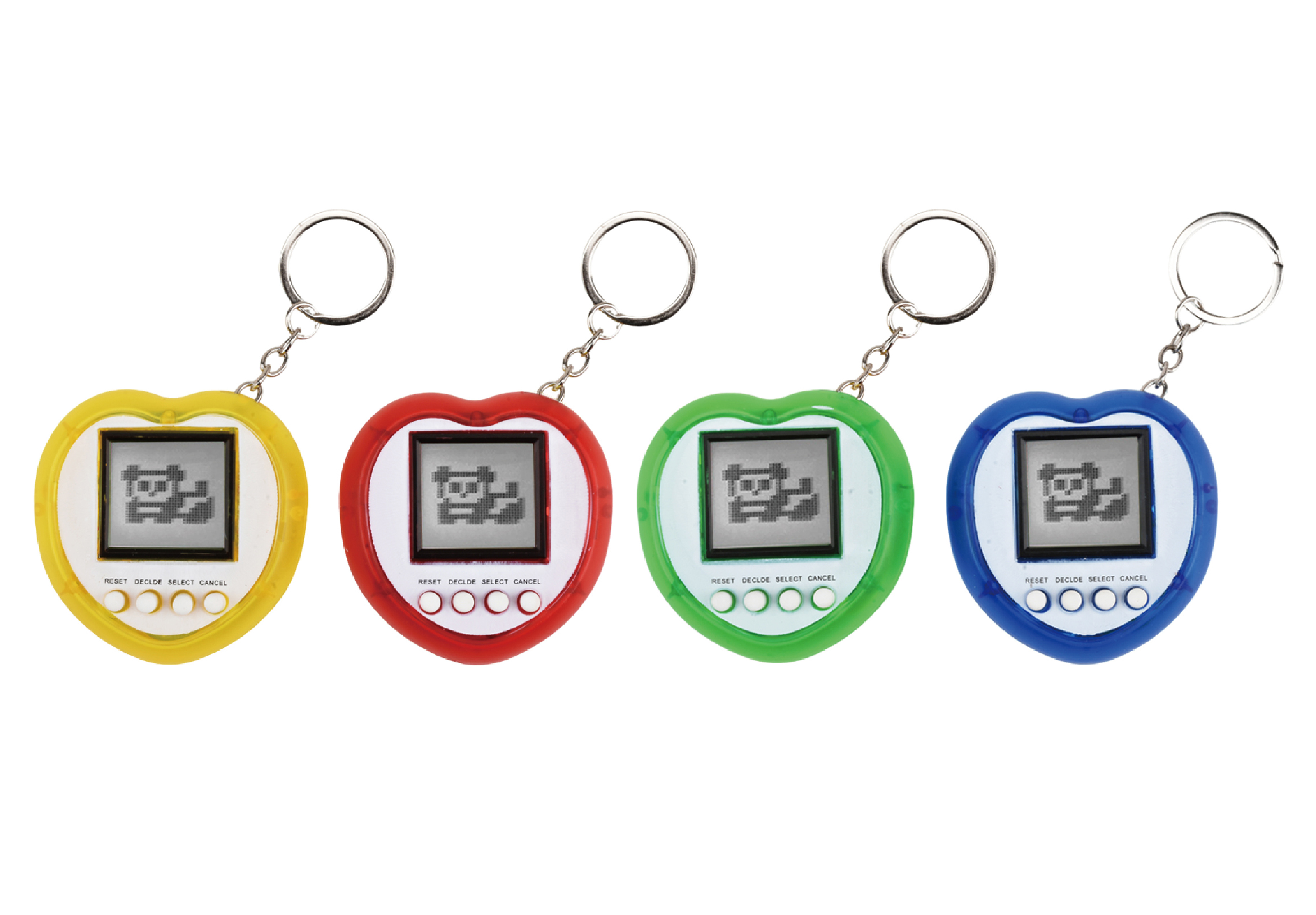 Mazlíček elektronický hra srdce. Rozměry 6,8x6,8x2,6 cm. S kroužkem na klíče. Display box 12 ks. 4 varianty - žlutá, červená, modrá, zelená. Baterie 2xAAA, nejsou součástí. Handheld herní konzole. Je možné si zvolit z velkého množství mazlíčků.