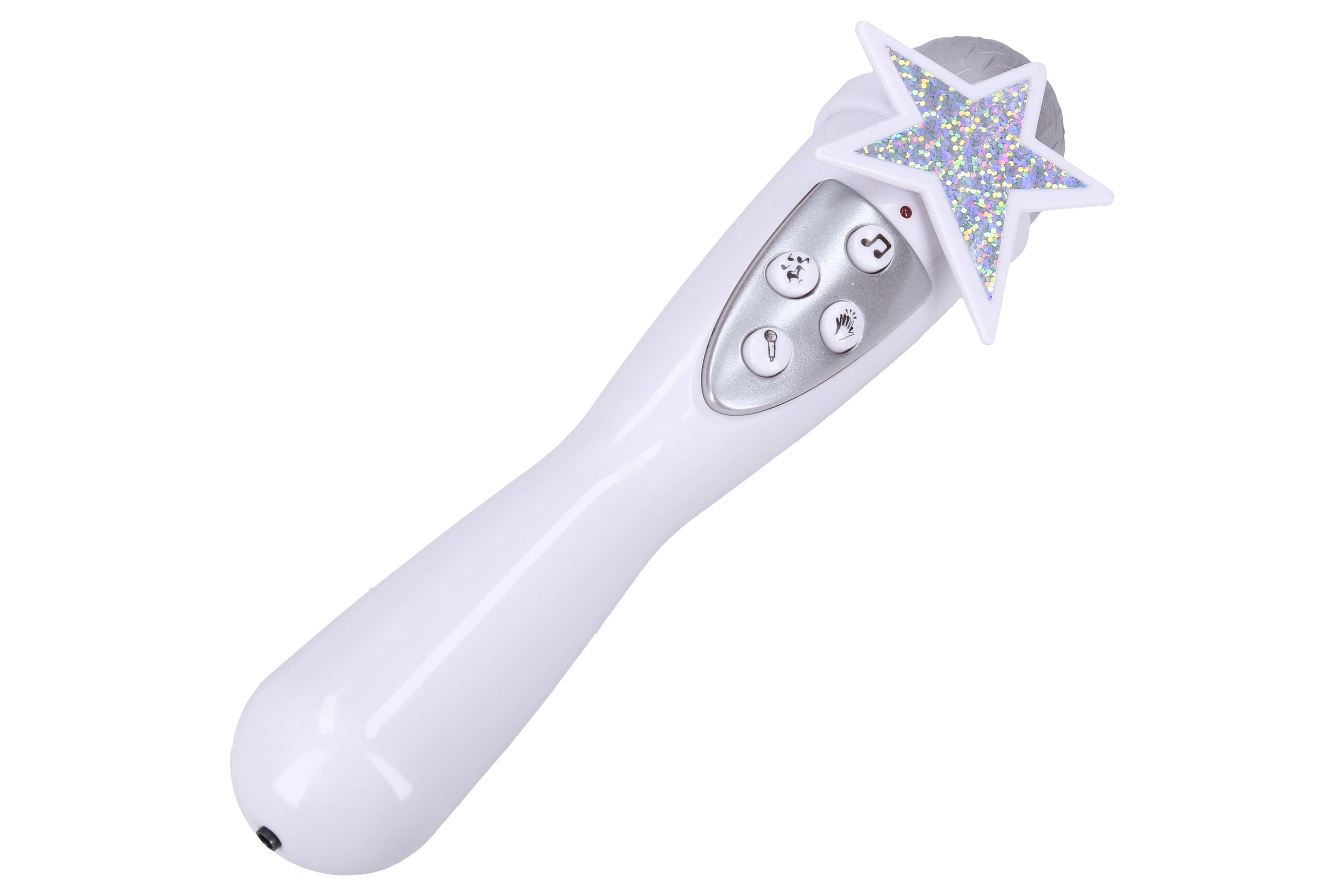 Mikrofon hvězda. Velikost 23 cm. Zvukové efekty. 3xAAA baterie součástí. 3 melodie, aplaus, pískot, automatické vypínání. Možnost připojení MP3 přehrávače nebo mobilu, kabel není součástí.