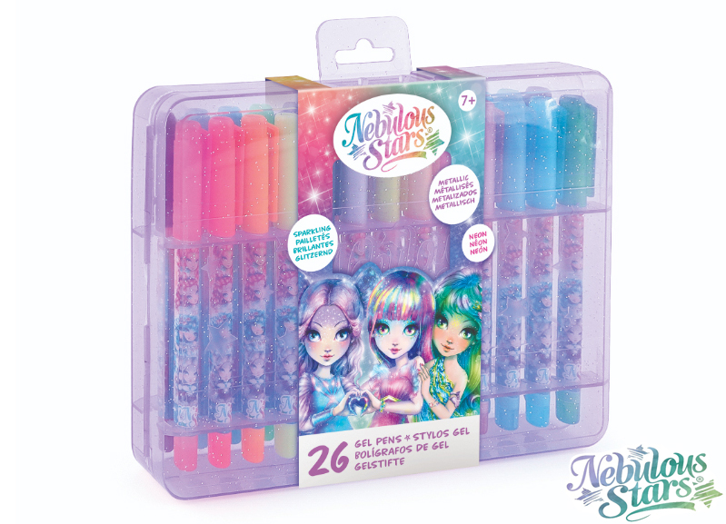 Nebulous Stars Gelová pera set. Plastový kufřík, který obsahuje 26 gelových per. Třpytivé neonové barvy. 9 per s třpytivým gelem, 8 metalických per, 8 neonových per, 1 černé gelové pero. Display box - 6 ks.