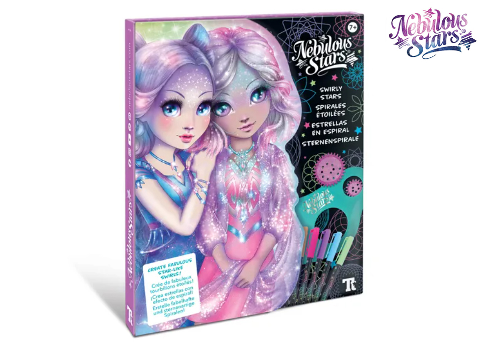 Nebulous Stars Maluj hvězdné spirály set. Obsah balení - 48 černých stránek, šablona na spirály a 7 koleček, 6 neonových gelových per, stránka se samolepkami. 36 stránek má ilustrace které můžete vybarvit a doplnit spirálami.