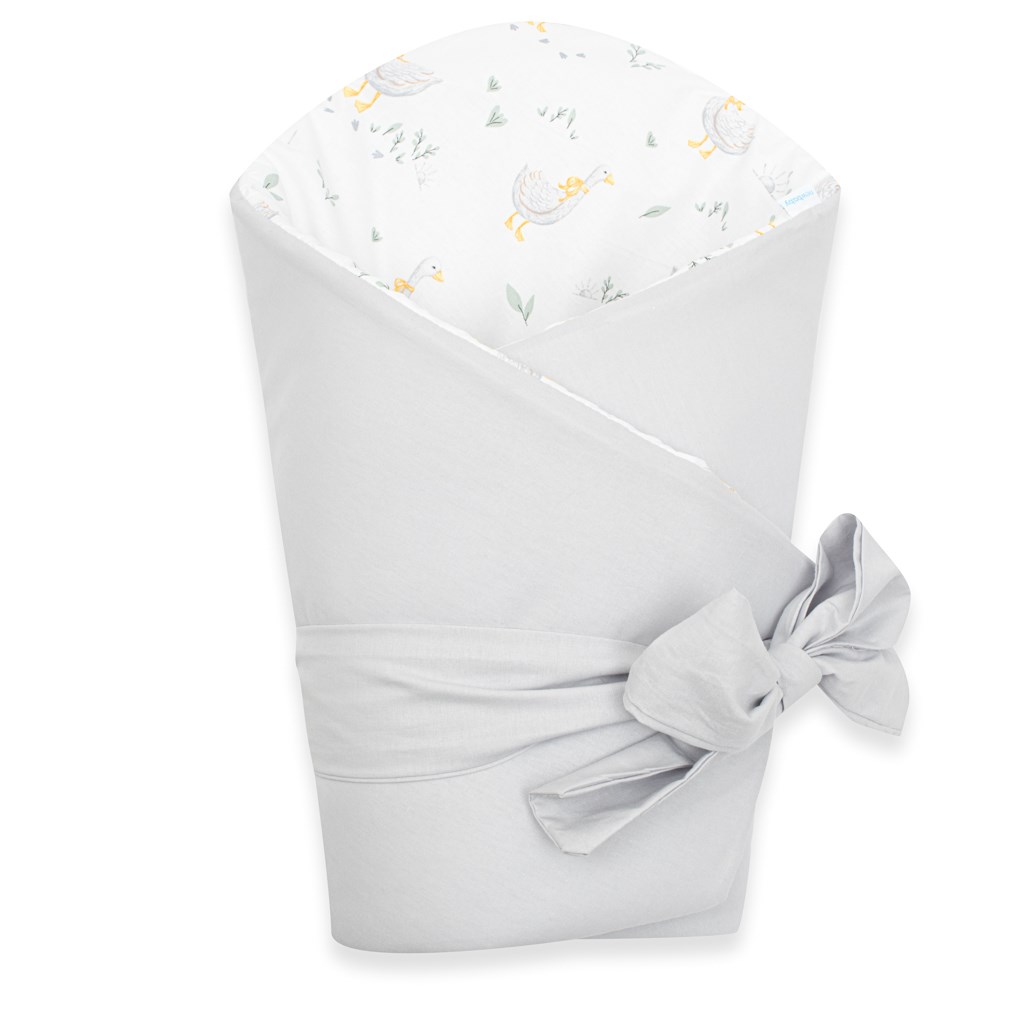 Nádherná dětská oboustranná zavinovačka české značky New Baby Husičky pro miminka. Zavinovačka je vyrobena z kvalitního a jemného materiálu, který zaručí vašemu miminku příjemné teplo. Výplň je až 3 cm co znamená, že zavinovačka je vhodná i na chladnější dny a je dostatečně pevná. Krásný dětský motiv s roztomilými husičkami, polahodí dětským očičkám. Zapínání na suchý zip i pásek na zavázaní na mašli.