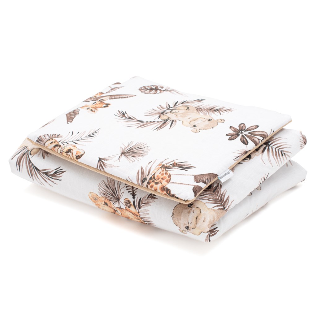 Nádherný oboustranný set New Baby Safari do kočárku. Set je vyroben ze dvou typů tkanin. Bavlněný materiál s krásným dětským motivem z jedné strany a Velvet materiál z druhé strany. Velvet je velice příjemný a jemný na dotek a po dlouhou dobu si zachovává svůj původní tvar. Je ideální jak pro miminka od narození, tak pro větší děti jako deka na hraní, do kočárku nebo na ven. Set obsahuje polštářek a přikrývku. Klademe důraz na kvalitu a proto je set z Velvet ušitý z velmi kvalitního materiálu, který nepouští barvu a nevyvolává alergické reakce. Set je jemný na dotek, hřejivý, tulivý, jedinečný a velmi odlišný od ostatních. Vše je vyplněno antialergickým vláknem. Složení: z jedné strany 100% bavlna potištěná krásným dětským vzorem, druhá strana je Velvet látka-100% polyester, výplň 100% antialergické vlákno. Materiál odpovídá normě Oeko-Tex Standard 100. Rozměry: polštářek: cca 30x25 cm, přikrývka: cca 75x50 cm. Tyto výrobky jsou bezpečné, protože: