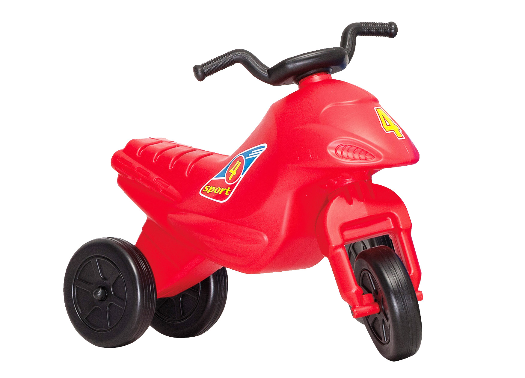 Odrážedlo Super Bike mini. Červená barva. Rozměry - délka 57cm, šířka 28cm, výška 41cm. 3 kola. Max nosnost 25 Kg.