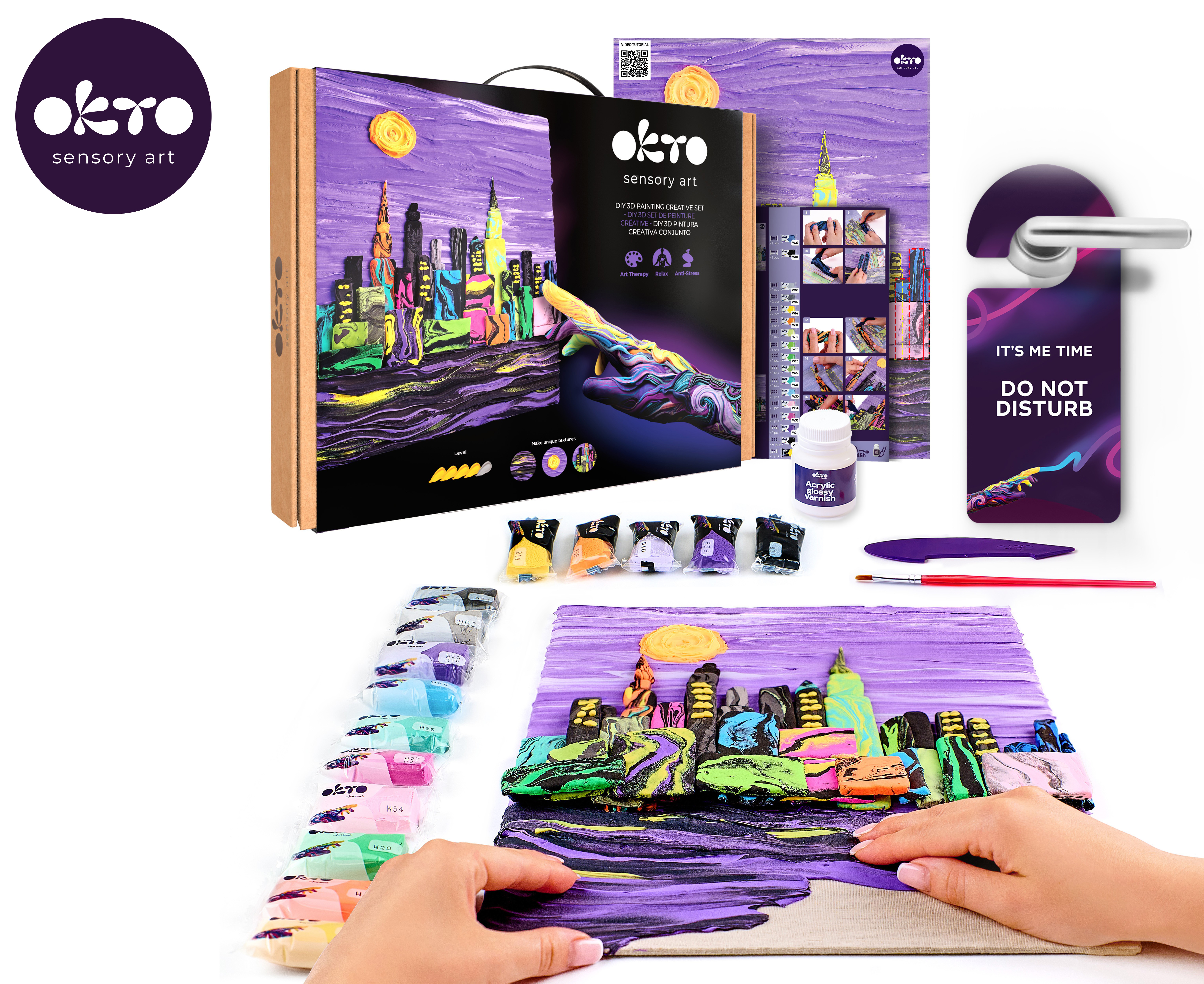 OKTO Malování hmotou motiv "#Skyline - New York". Velikost plátna 30x40 cm. Obtížnost 4/5. Obsah balení - přírodní plátno, obrázkový návod, modelovací nástroj, sada samoschnoucí modelovací hmoty, akrylový lak 20 ml, štětec.
