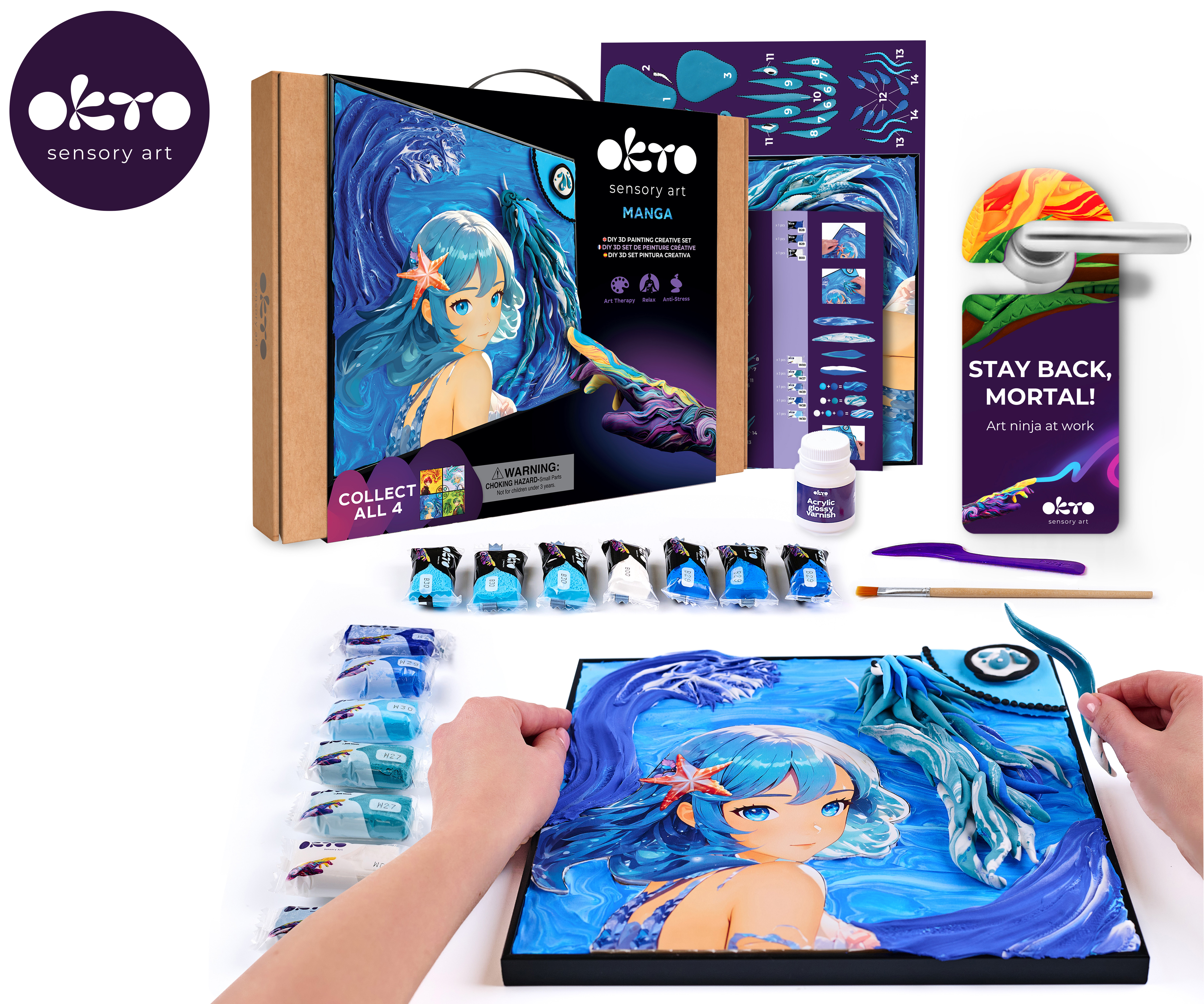 OKTO Manga motiv živlů "Voda". Velikost plátna 30x40 cm. Vytvarujte obrázek podle návodu. Obsah balení - plátno, obrázkový návod, modelovací nástroj, sada samoschnoucí modelovací hmoty, akrylový lak 20 ml, štětec.