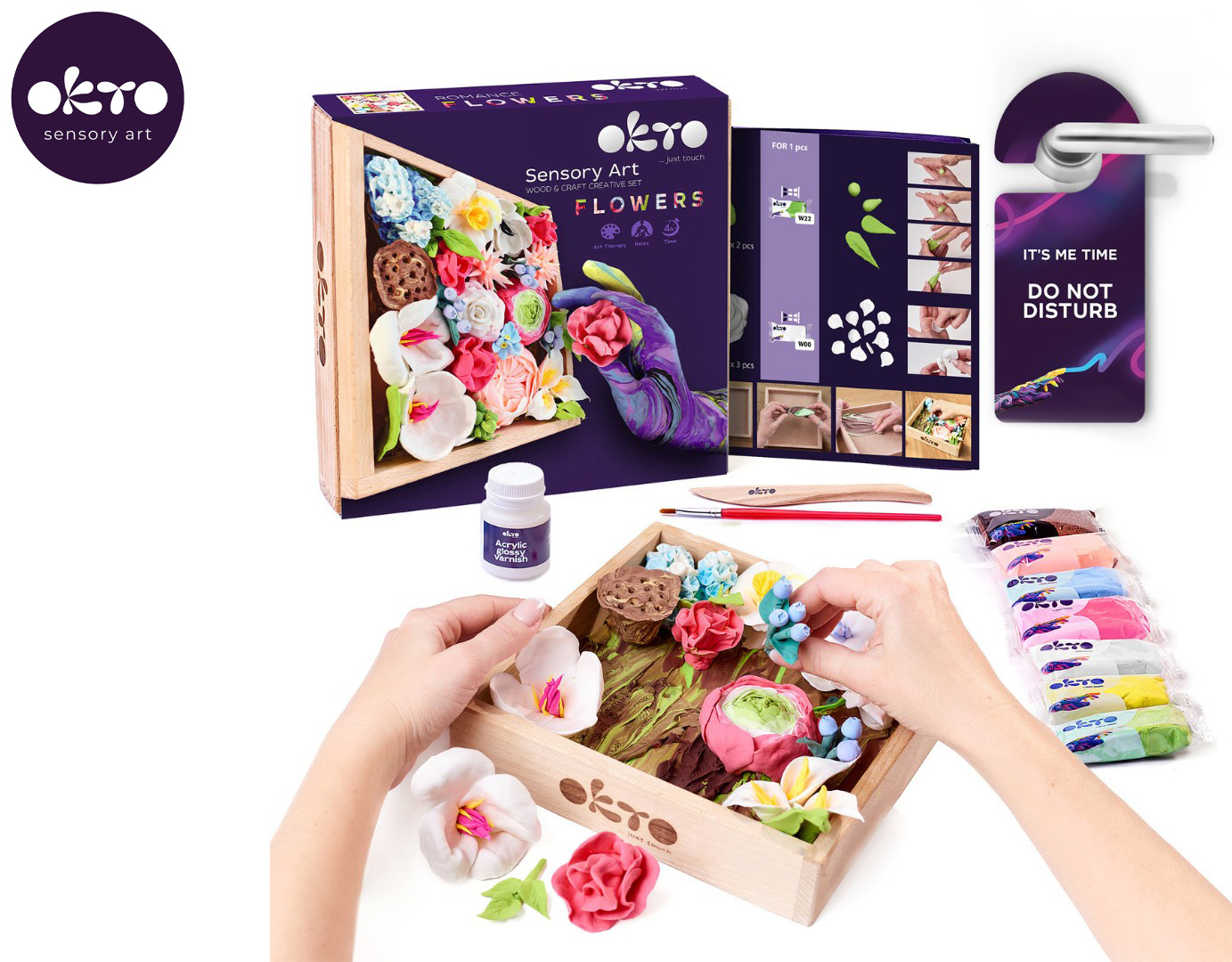 OKTO ROMANCE Výtvarná modelovací sada DIY květiny s dřevěným rámem. Velikost rámu 21x21 cm. Obsah balení - přírodní plátno, návod, dřevěný tvarovací nástroj, 40 ks modelovací hmoty.