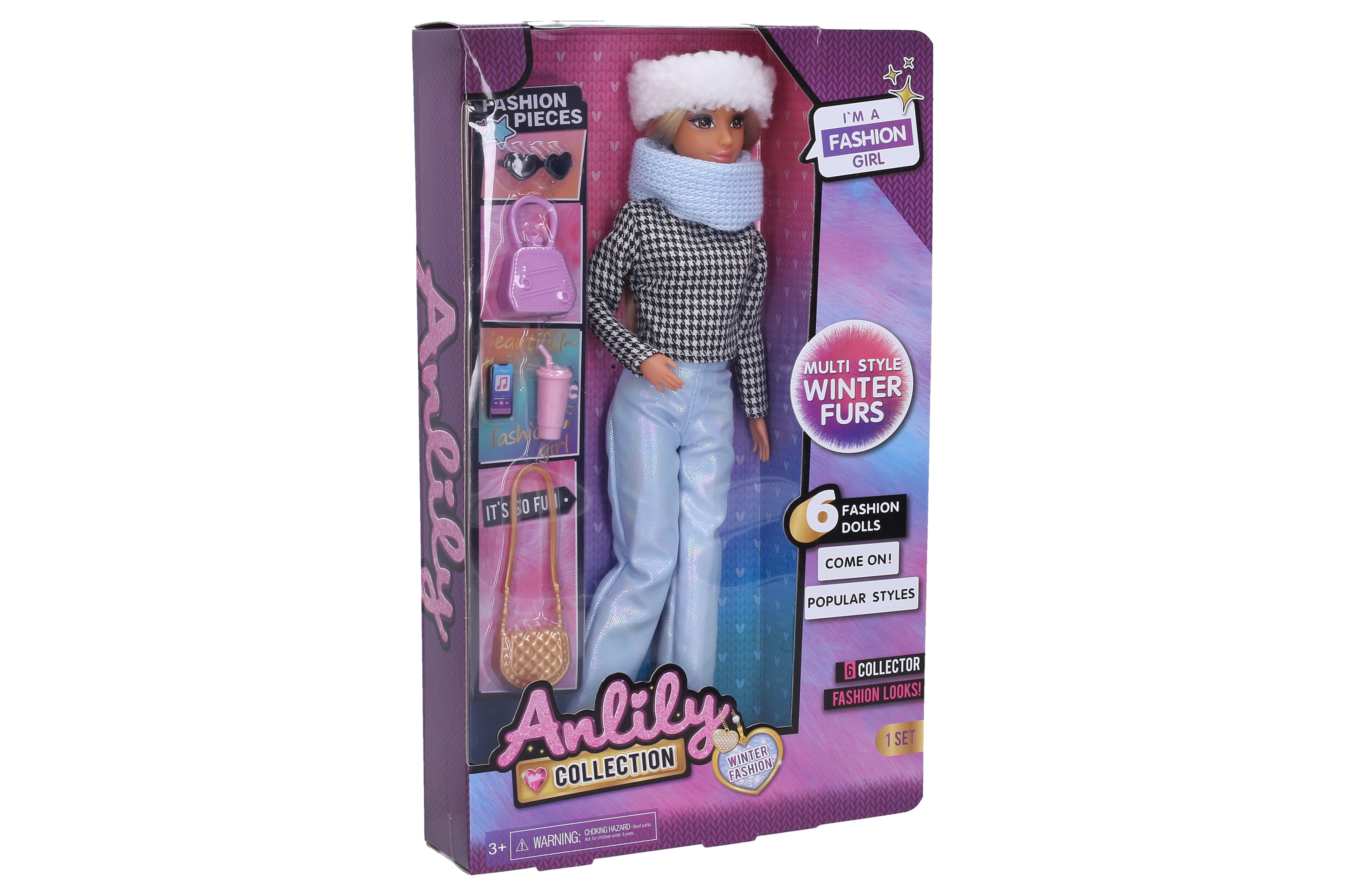 Panenka modelka s doplňky. Velikost 29cm. Obsahuje panenku, 2 kabelky, kelímek, mobil, sluneční brýle.