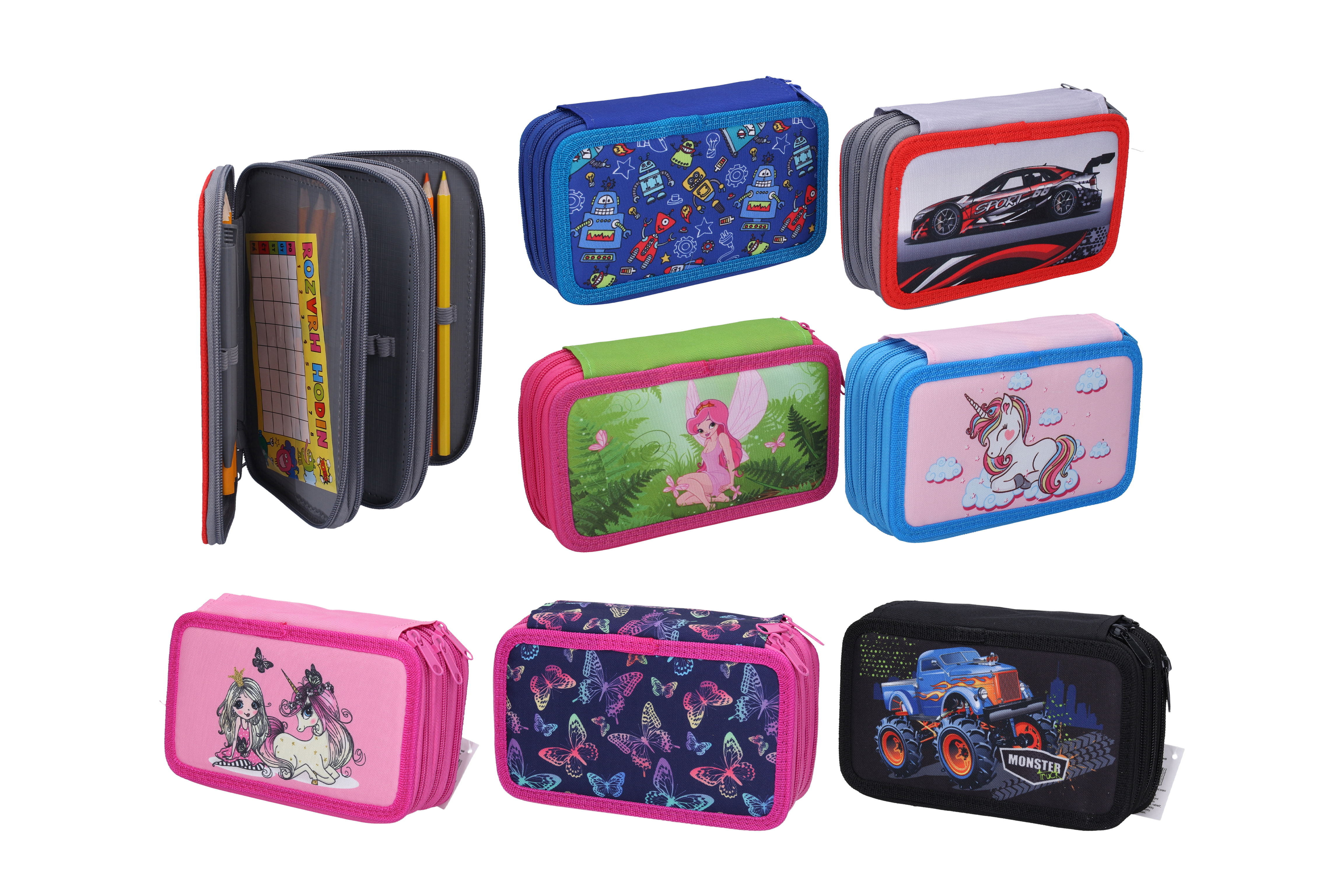 Třípatrový penál s výbavou je určen pro žáky základní školy. Každé jednotlivé patro se uzavírá na samostatný zip. Pouzdro má pružné gumové poutka pro uložení psacích potřeb.