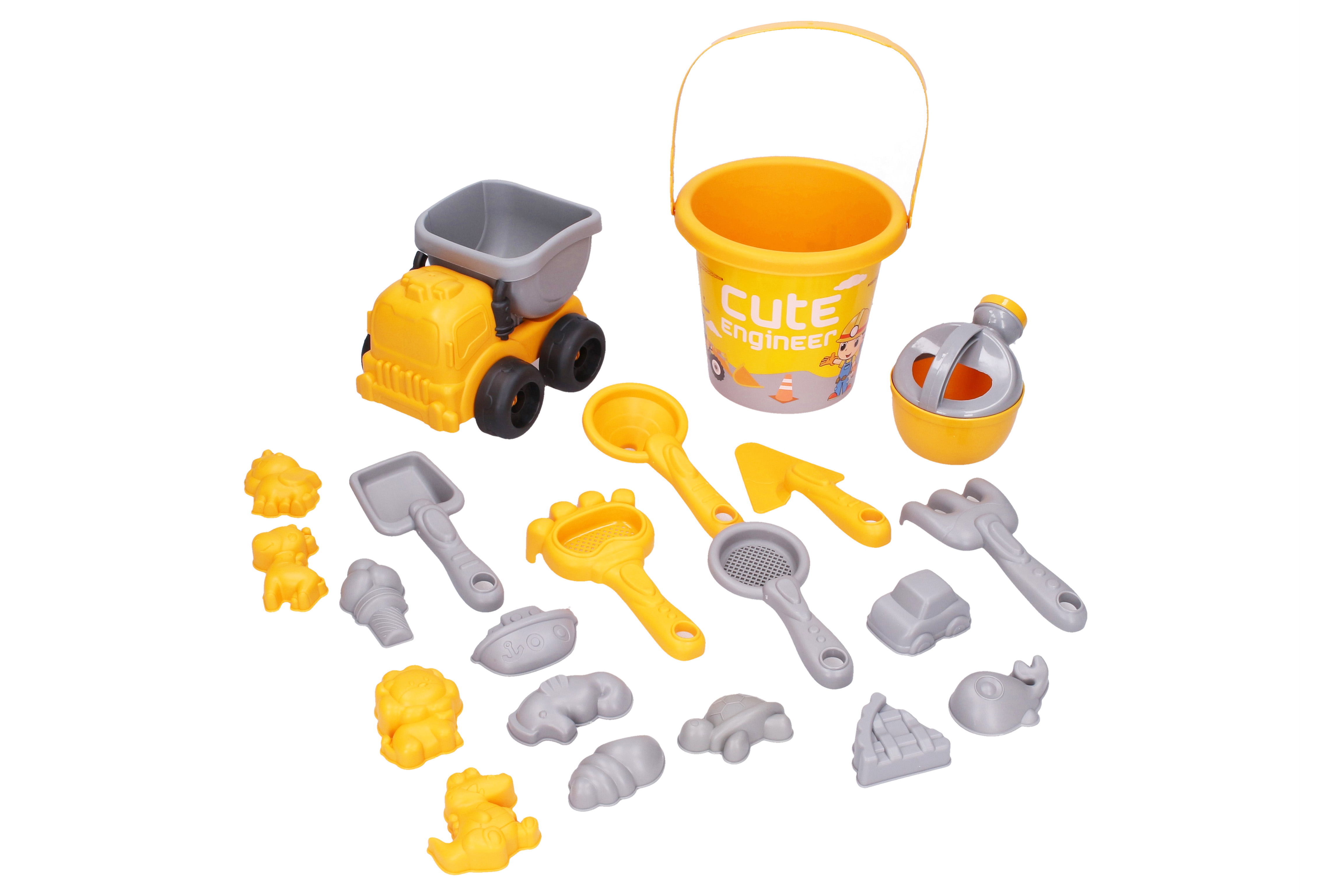 Sada na písek 21 ks. Obsahuje auto, kyblík, konvičku, 12 formiček, sítko, lopatky, hrabičky.