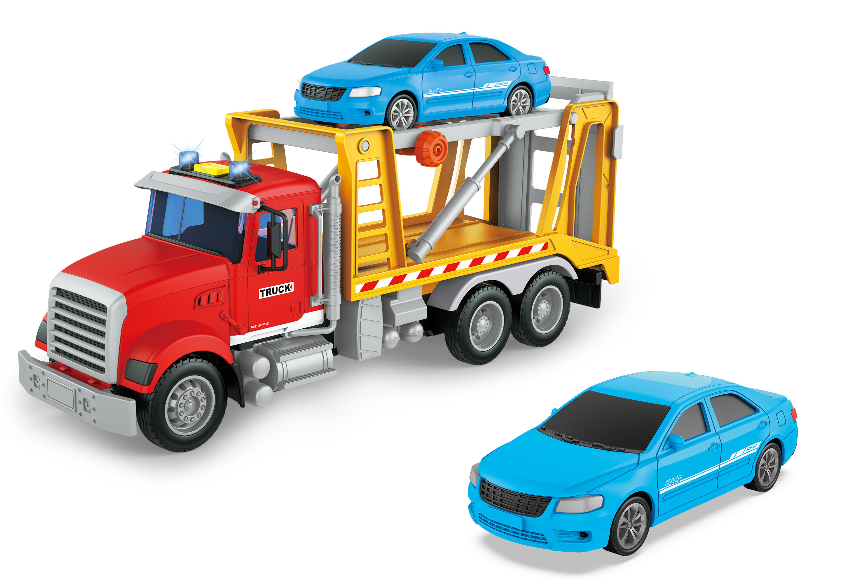Tahač s autem a efekty. Rozměry 32x9,5x12 cm. Na setrvačník. Světelné a zvukové efekty, aktivace tlačítkem na kabině. 3xAG13 baterie do střechy součástí.