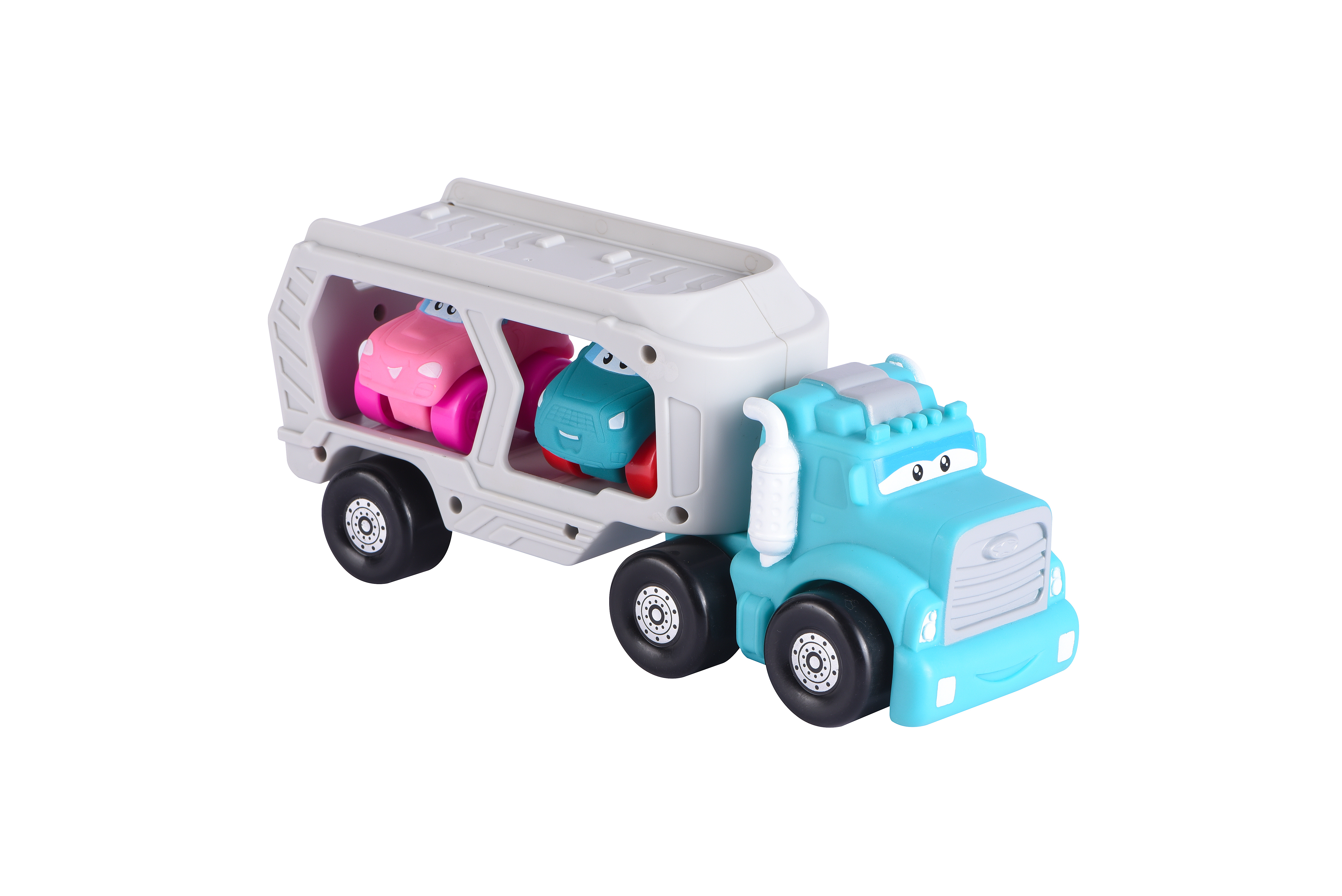 Tahač s auty. Velikost tahače 24 cm. Obsahuje tahač a dvě auta. Volná kola.
