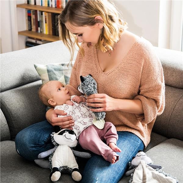 Měkký usínáček z různých materiálů se zajímavými strukturami je vybavený vnitřní chrastítkem, rozvíjí kognitivní schopnosti malého dítěte a poskytuje pocit bezpečí. Stužky přišité k dece pomohou při cvičení zručnosti, zatímco poutko s oboustranným suchým zipem připevněným k hračce zajistí, že se dudlík bude vždy na blízku.