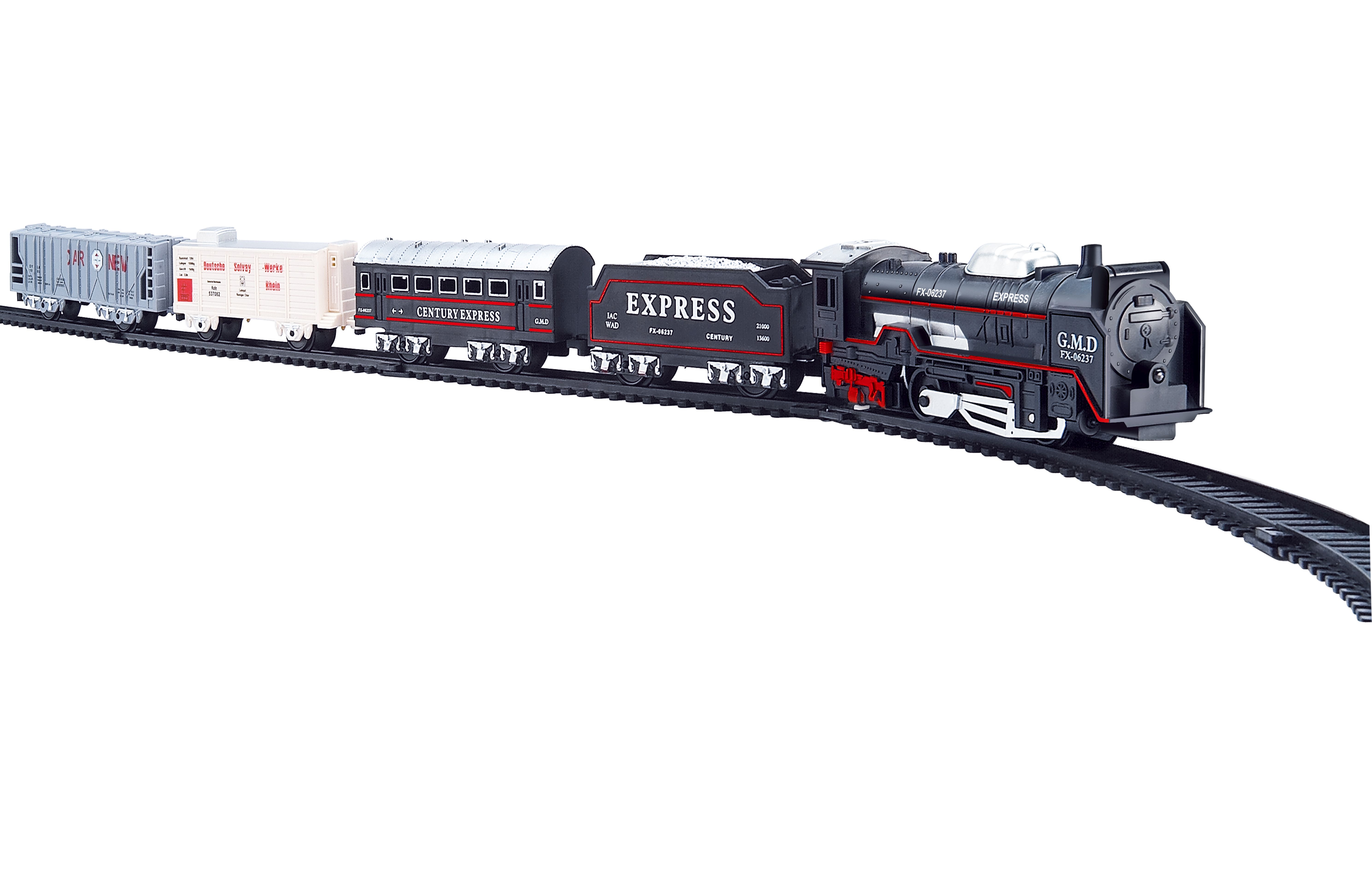 Vlak set. Délka trati 210 cm. Součástí mašinka, 4 vagóny, 4 rovné kolejnice, 10 zahnutých kolejnic. Velikost mašinky 13 cm, vagónů 10-13 cm. 2xAA baterie do mašinky nejsou součástí. Přepínač ON/OFF na pravé straně mašinky.