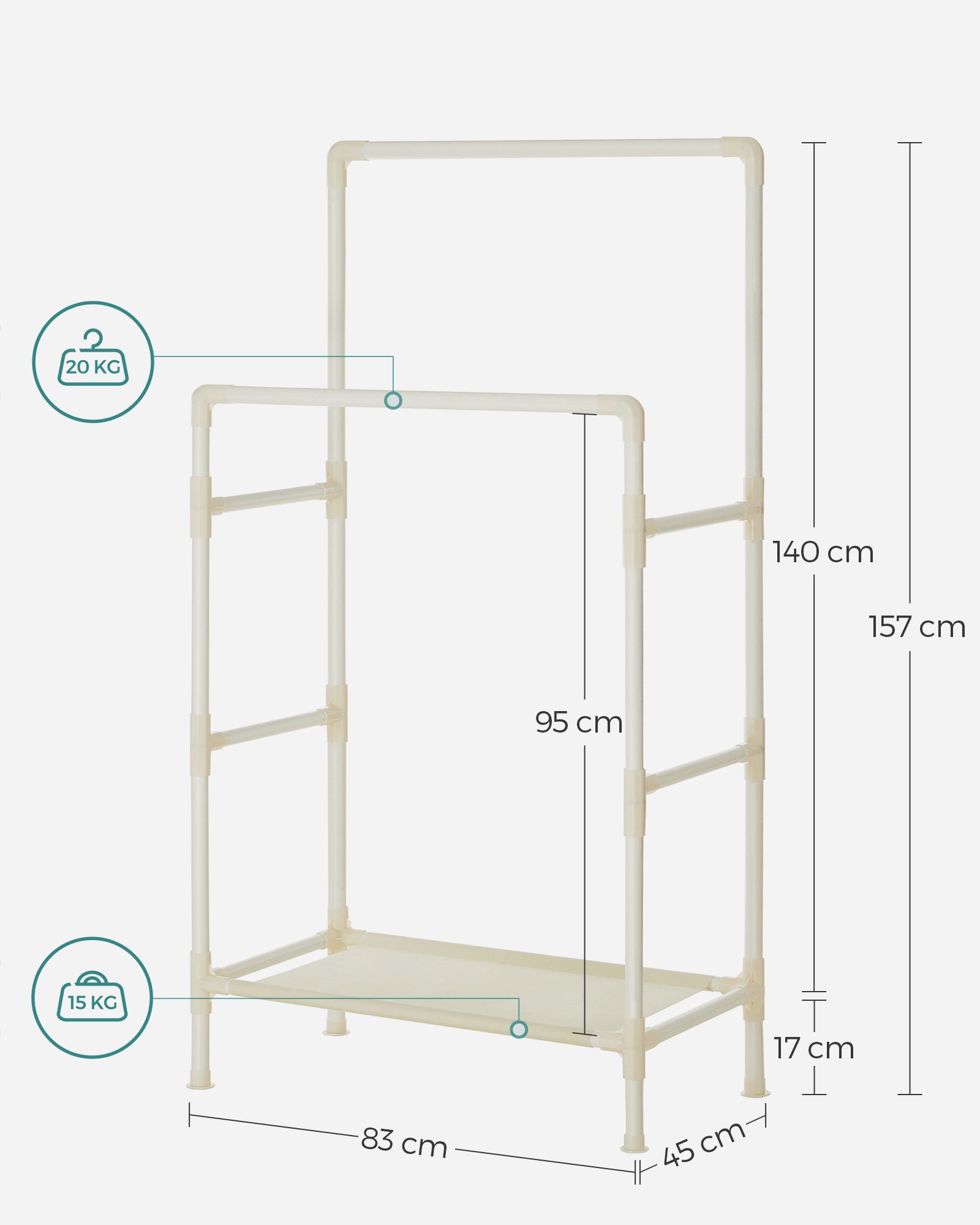 Stojan má 2 velmi stabilní a odolné tyče pro zavěšení kabátů, bund, šatů, košil nebo sak. Na tyčích můžete také zavěsit šály, šátky nebo komíny. Je obzvlášť užitečný během svatební a svatostánkové sezóny, kdy potřebujete mít připravené perfektně vyžehlené košile nebo šaty.